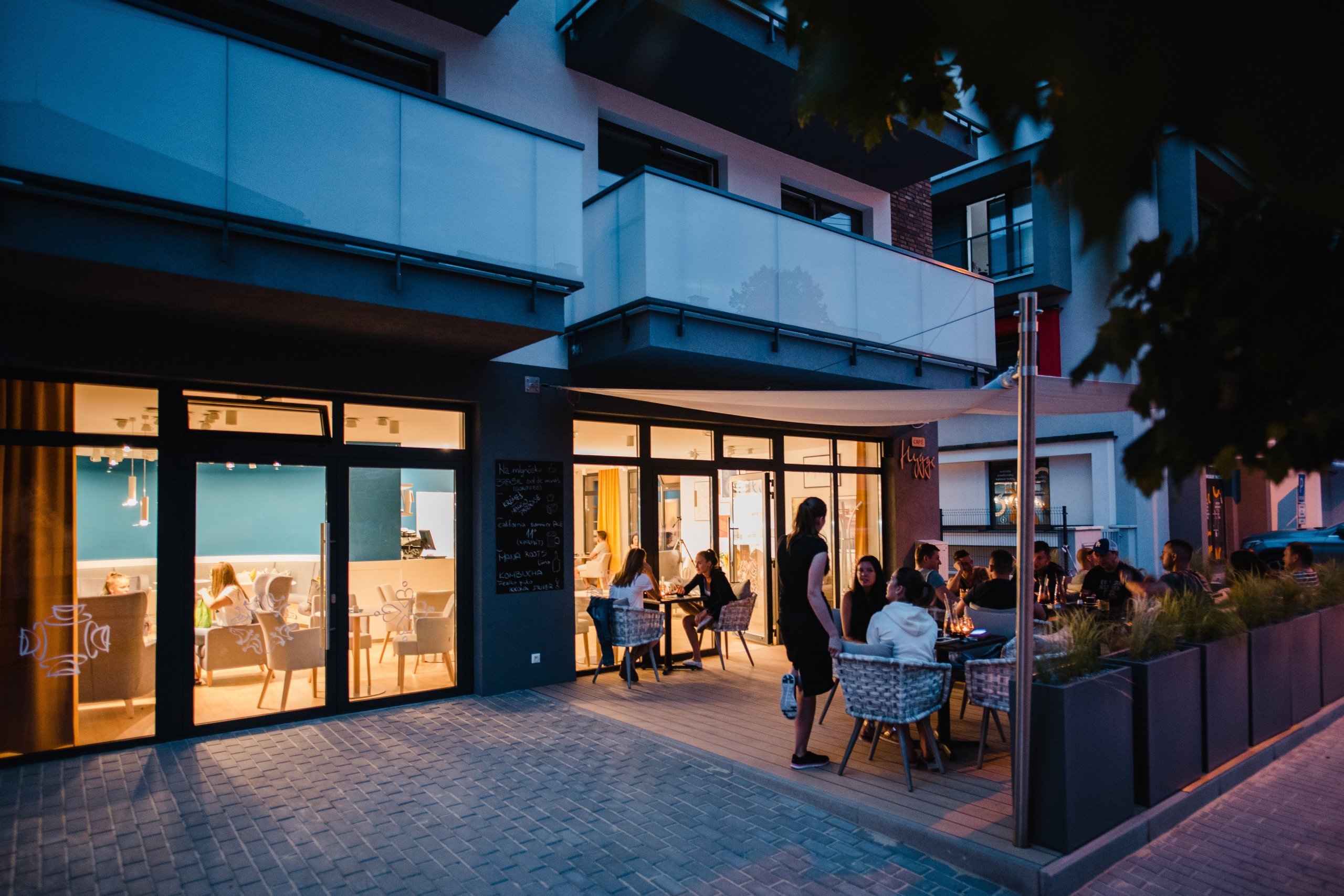 Cieľom bolo vytvoriť jedinečný a originálny interiér kaviarne v škandinávskom štýle podľa požiadaviek investorov s použitím modrej petrolejovej farby, dominujúcej v priestore. V novostavbe sme sa museli vyrovnať s konštrukciou stĺpa v strede dispozície, ktorý do nej výrazne vstupoval. Nadväzujúcimi prvkami sme priestor rozčlenili do viacerých zón s osobitým charakterom, ako napríklad intímny priestor s lavicovým sedením v kruhovom zálive, pohodlné sedenie pri bio krbe, ako aj stoličkové sedenie pozdĺž výkladového presklenia. Paraván prekrývajúci vstupy do WC vytvoril čítací kút, v predstavách investora slúžiaci ako jeho osobné miesto. Centrálnym dominantným prvkom kaviarne je barový pult so zakrivenou vitrínou na zákusky, ktoré sa ponúkajú zákazníkom ´´ako na dlani´´. Ozvláštnením priestoru a prvkom, odlišujúcim kaviareň od iných v meste, je atypický strop. Jeho výška nám neumožnila pracovať s jeho plasticitou a zároveň konštrukcie prekladov vytvárali rušivý element priestoru. Prekrytím týchto prvkov, sa získal priestor na osadenie rozvodov klimatizácie a audiosystému. Plasticitu sme dotvorili originálnou kolážou kaviarenského porcelánu, s použitím kombinácie kotvení skrutkami a špeciálnymi lepidlami. Samotné stvárnenie stropu v zákazníkoch neustále vytvára nadšenie a úsmevnú otázku : ´´Ako to tam drží ?´´ Celý priestor je zariadený v šedých tónoch a jemných odtieňoch dreva, aby bolo jednoduché meniť jeho náladu napr. výmenou závesov a farebných doplnkov. Podlaha je vinylová a zariadenie je kombináciou mobiliáru a nábytku na mieru. Celý koncept sme dotvorili v spolupráci s dizajnérkou Johannou Bilak, žijúcou v Holandsku, ktorá pre kaviareň navrhla logo. Kaviareň dopĺňa terasa, ktorá je vstupným prvkom do kaviarne. Je zvýšená o úroveň jedného stupňa voči chodníku, čím nevytvára bariéru ale je opticky odčlenená od okolia. Ochrana proti slnku a dažďu je tvorená tieniacim rolom, ktorého subtílna konštrukcia sa najlepšie hodila k celému návrhu.