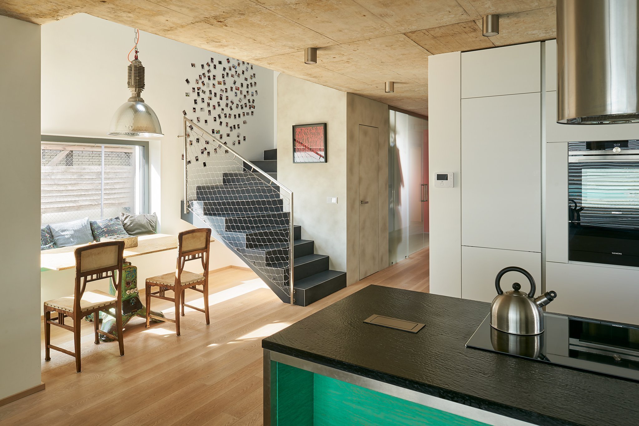První věc, která v domě na první pohled zaujme, je samotný prostor. V nepřeplněném interiéru je proto místo pro jednotlivé kusy nábytkua zajímavé detaily. Základ interiéru je barevně neutrální: šedý beton, dubová podlaha, šedočerné kovové schodiště a bíle natřené stěny. To všechno umožnilo při volbě zařízení míchat více stylů.