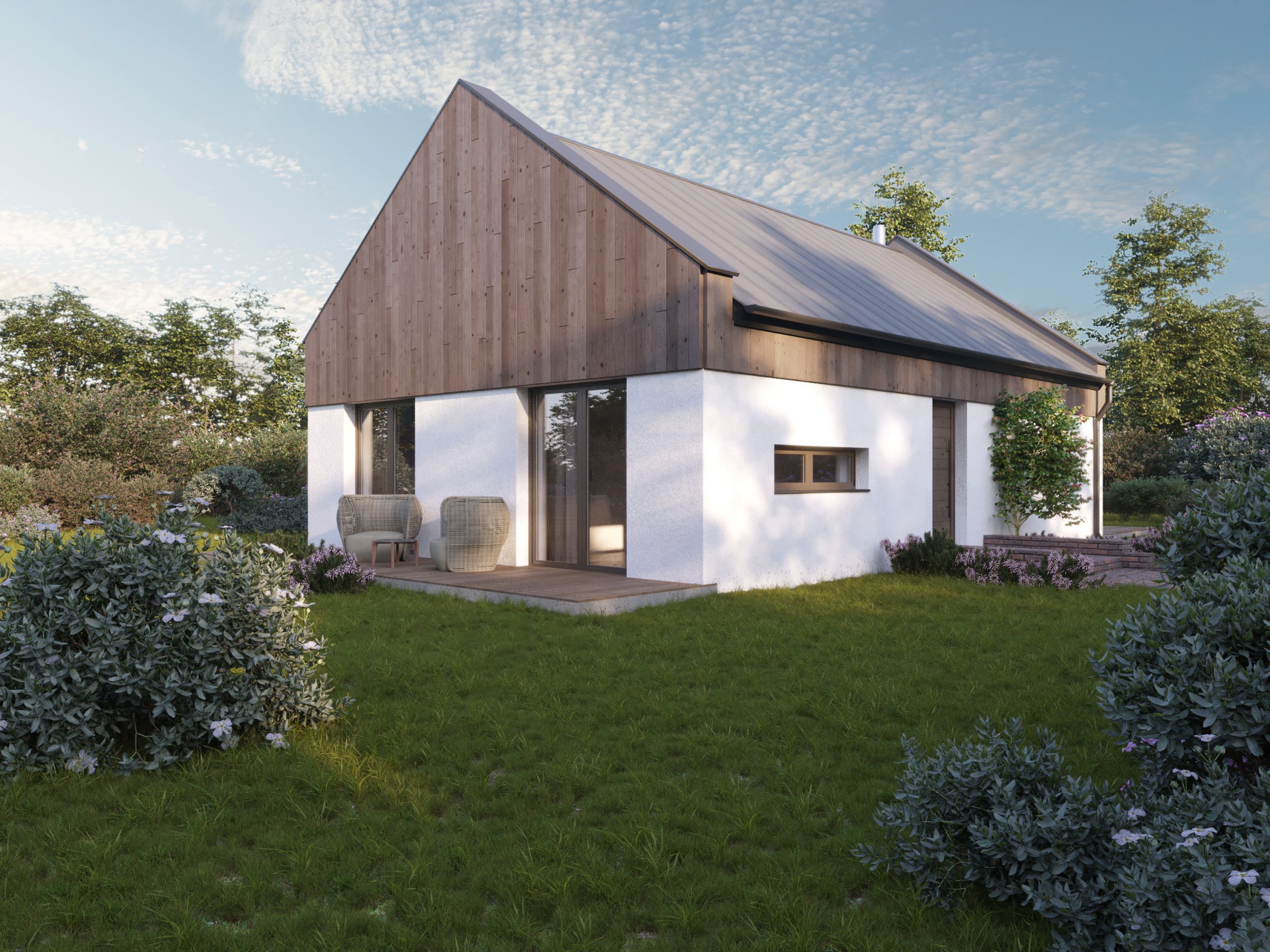 Představujeme vám jednoduchou stavbu se sedlovou střechou vycházející z oblíbené typové dřevostavby Easy 69. Zvětšené místnosti poskytují dostatečný prostor pro menší rodinu nebo pár. Dřevostavba svým stylem zapadá do vesnické i městské zástavby a je vhodná rovněž na malé pozemky. Dominantou této stavby je zvýšená atika.