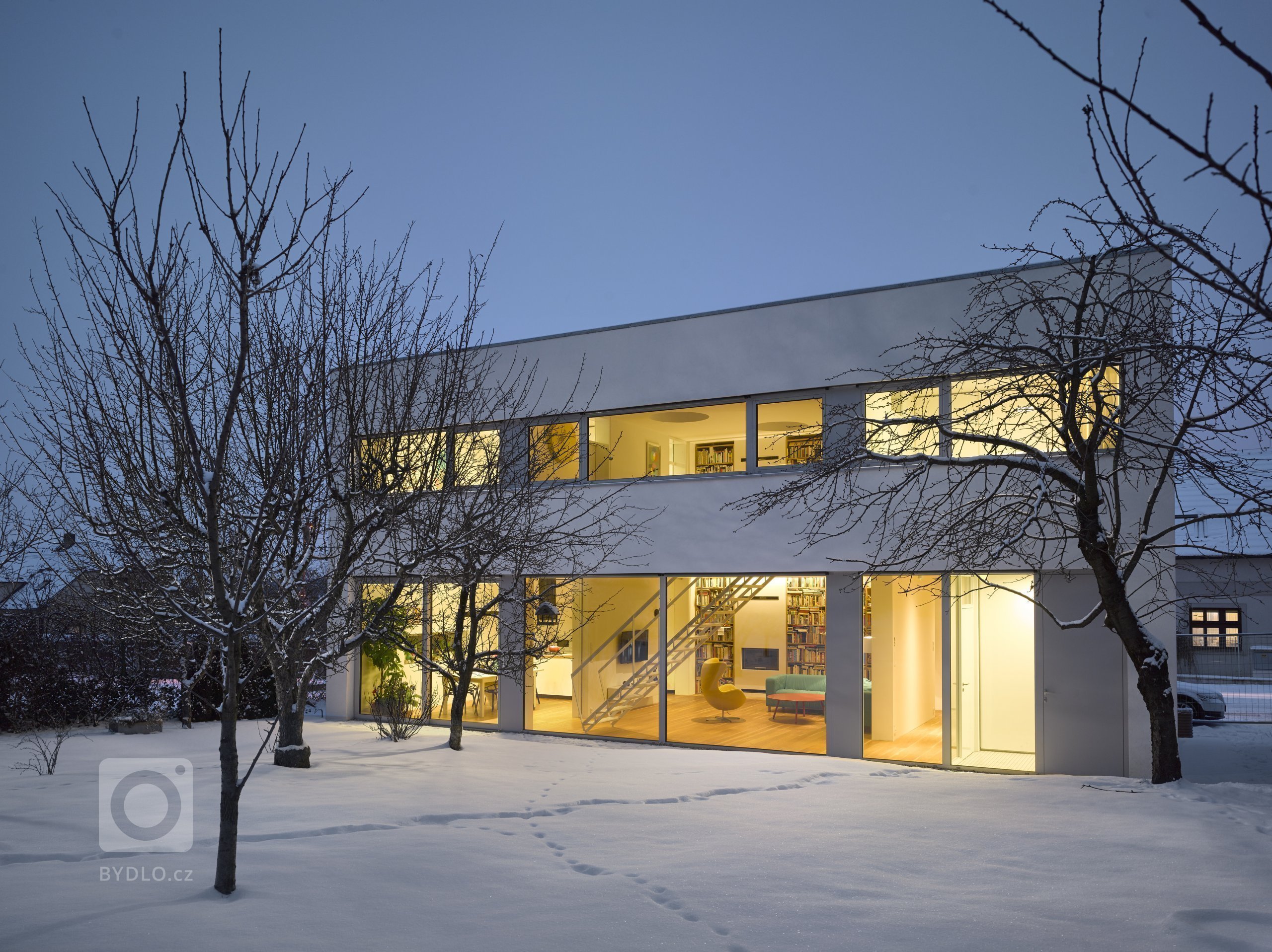 Do domu se musí vejít mých několik tisíc knih, chceme snídat na zahradě, měla by tu být moje pracovna a auto může stát před domem.. Projekt se vydal koncepcí hry s analogií bílého listu papíru, který si bude rodina postupně sama dobarvovat svou prací, sbírkou umění svých přátel výtvarníků aj. / paní domu Šárka Bulčíková pracuje s porcelánem v zahradním atelieru domu, syn Eda se baví fotografií../ Dům je uzavřený směrem do veřejného prostoru, avšak maximálně otevřený do zahrady jihozápadní orientace. Dominantu interiéru tvoří knihovna prorůstající přes dvě podlaží s vestavěným krbem a tři kruhové světlíky na stropě. Světlíky přivádějí do domu více denního světla, zároveň umožnují rodině noční průhledy na hvězdnou oblohu z pohovek pod nimi. Počet světlíků tvoří analogii členů rodiny žijících v domě. Petr je otevíratelný směrem na střechu, Šárka a Eda jsou „napevno“. V prvním podlaží domu je kuchyně s jídelnou navazující na hlavní obytný prostor, který je možné posuvnými dveřmi opticky oddělit. Dále je zde prádelna, sklad