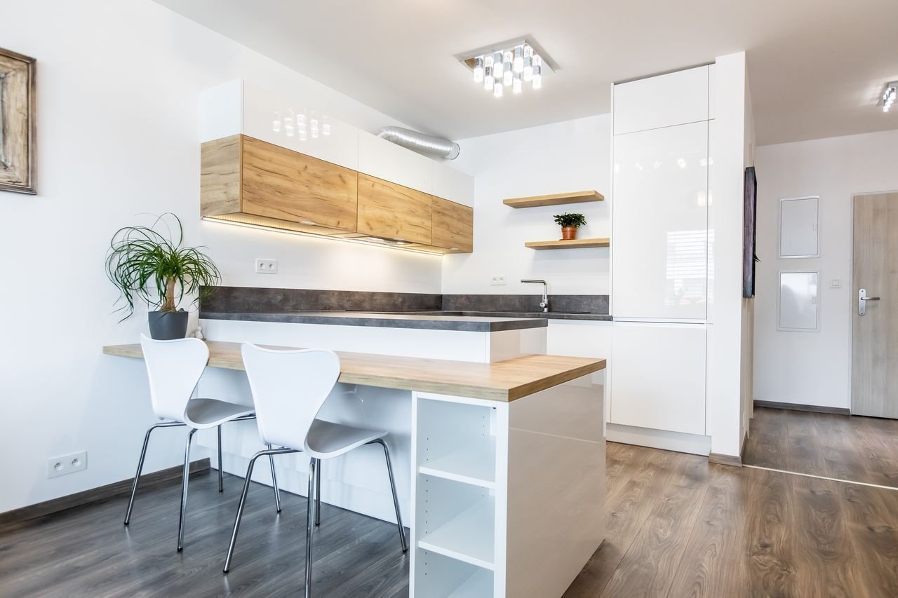 Horné skrinky: Dub zlatý v kombinácii s bielym vysokým leskom