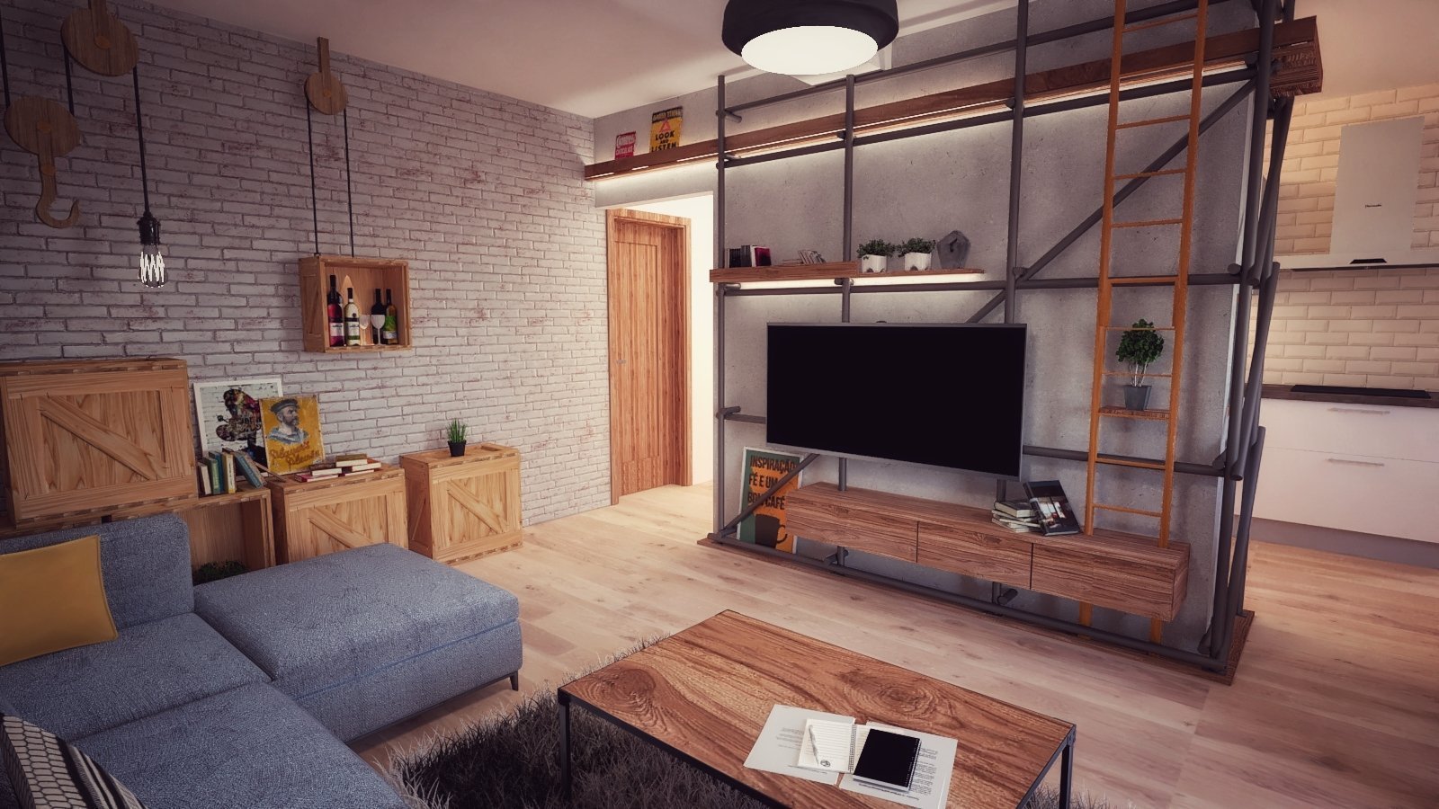 Mladý manželský pár chcel poradiť s riešením bytu. Majú radi industriálny štýl, no zároveň chceli niečo nápadité, niečo čo ľudí prekvapí. Veľa prvkov mali už v interiéri zakúpených, ktoré sa meniť nemohli... pohovka, kreslo, betónová tapeta, stôl a stoličky. Stavebné lešenie sme povýšili na dominantu celého interiiéru. Doplnili sme ho o rebrík a nahrubo opracované dosky, ktoré slúžia ako police. Z jednoduchých prepravných debien v kombinácii s lanami a kladkami sme získali kreatívny úložný priestor. Radi navrhujeme interiéry trochu INAK, dúfame, že sa nám to podarilo aj tentokrát.