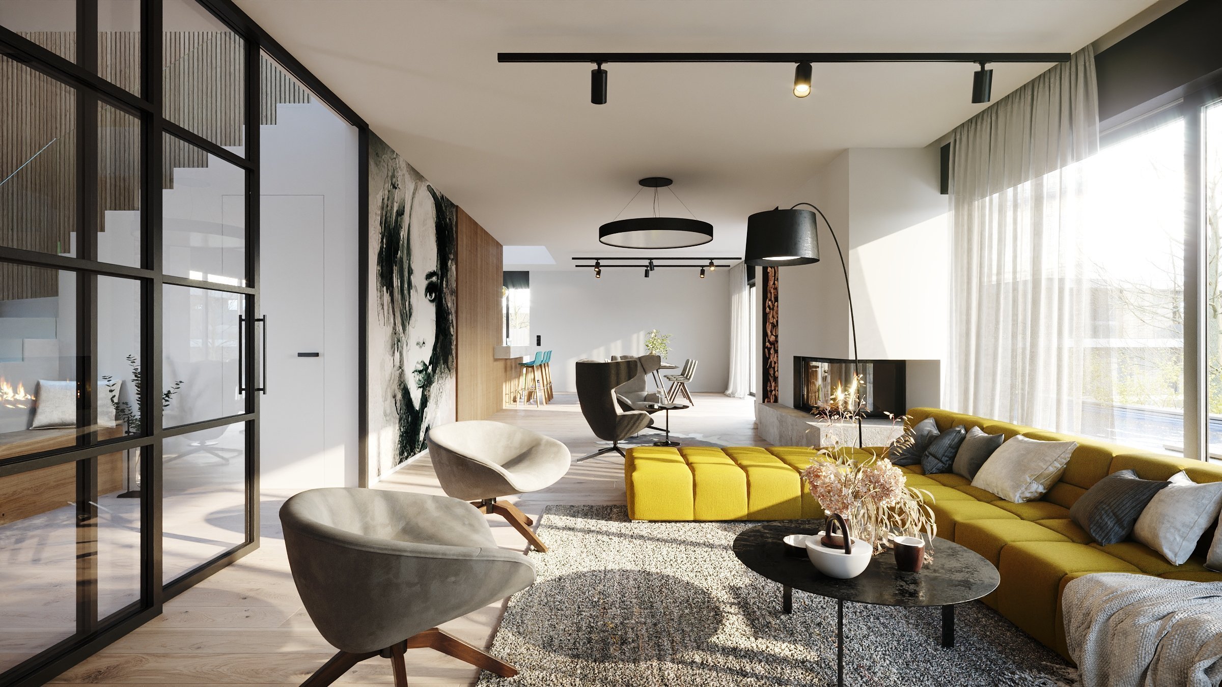 Interiér projektu Na Meandru vychází z architektury a konceptu celého developerského projektu. Design domů je inspirován přírodou a sluncem a zároveň ale i futuristickou, nejmodernější architekturou.