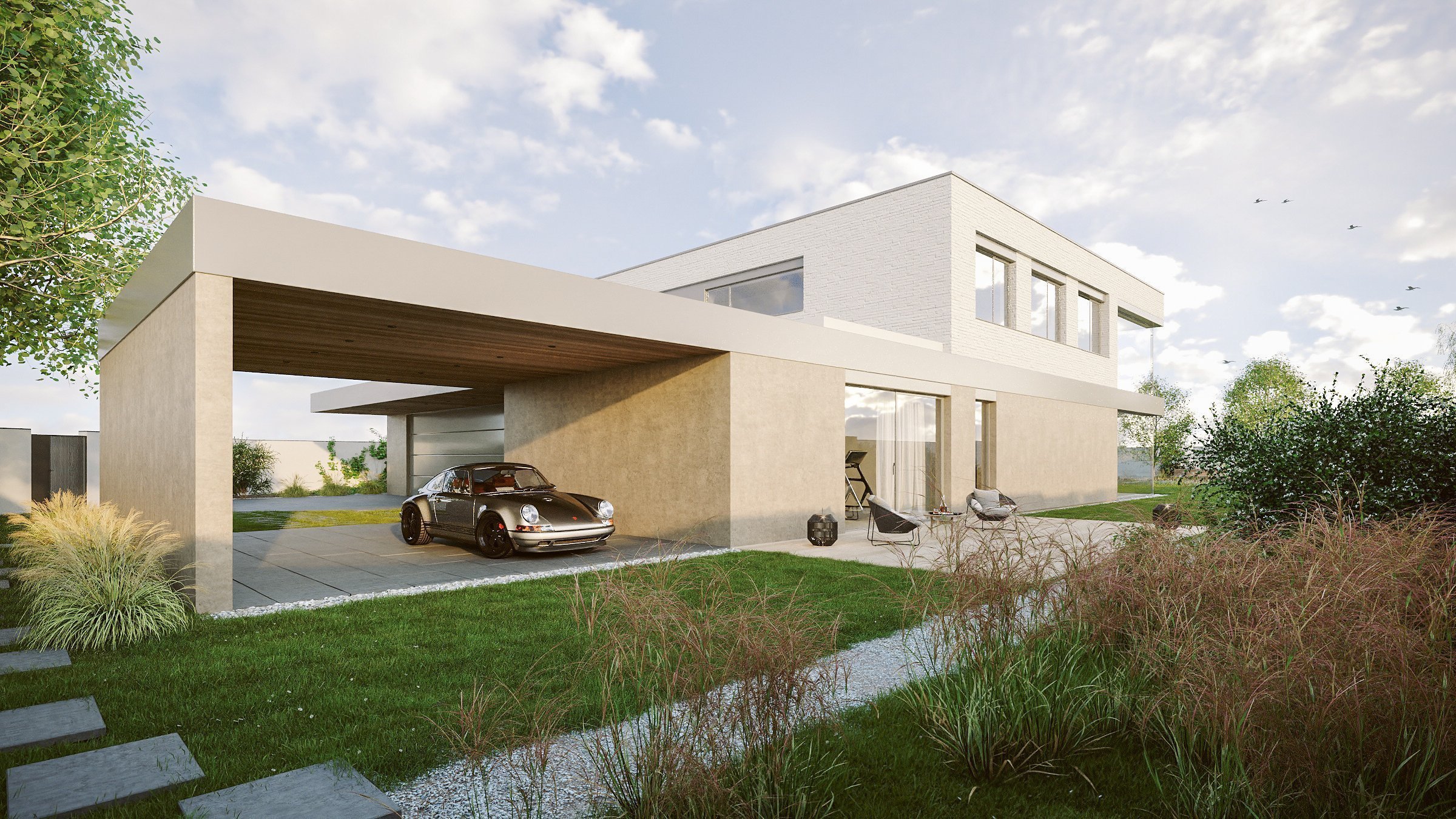 Hlavními prostory domu jsou velká kuchyně s jídelnou, která je oddělená od obývacího prostoru s krbem. Obývací pokoj je otevřen do patra a prosklen rohovým zasklením v obou podlažích. Hlavní obytné plochy jsou obráceny do prostorné terasy v přízemí a v horním patře na balkón. Vstup do domu je lemován horizontálním zastřešením které navazuje na jednopodlažní část objektu.