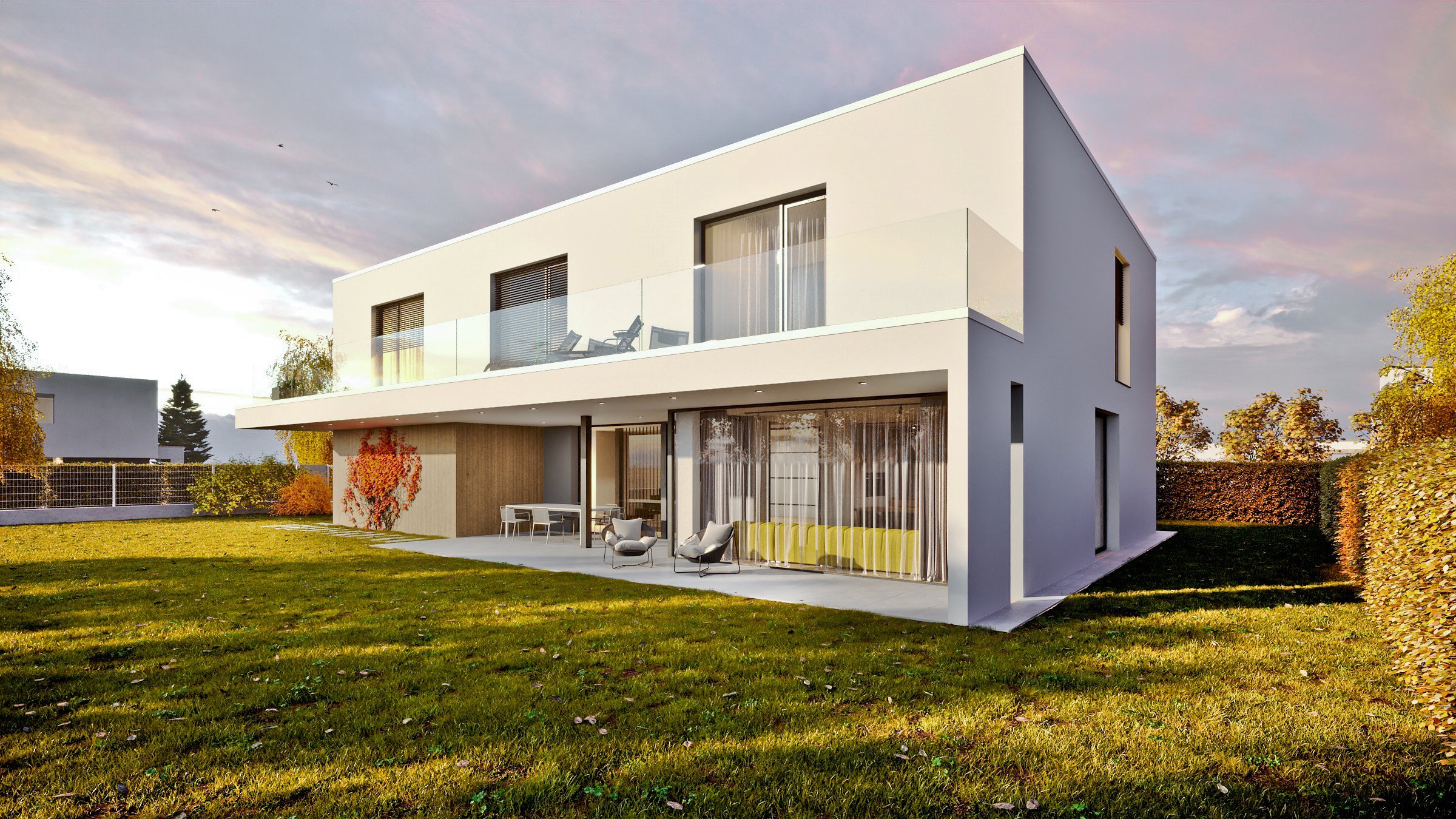 Přízemí dominuje velká kuchyně s jídelnou a obývací pokoj s krbem. Velké prosklené plochy navazují na zastřešenou terasu. V patře se nacházejí čtyři ložnice, prostorná šatna, dvě koupelny a sauna. Světlá fasáda a její přímé linie jsou zjemněny stěrkou se svislým dezénem připomínajícím laťování dřeva.