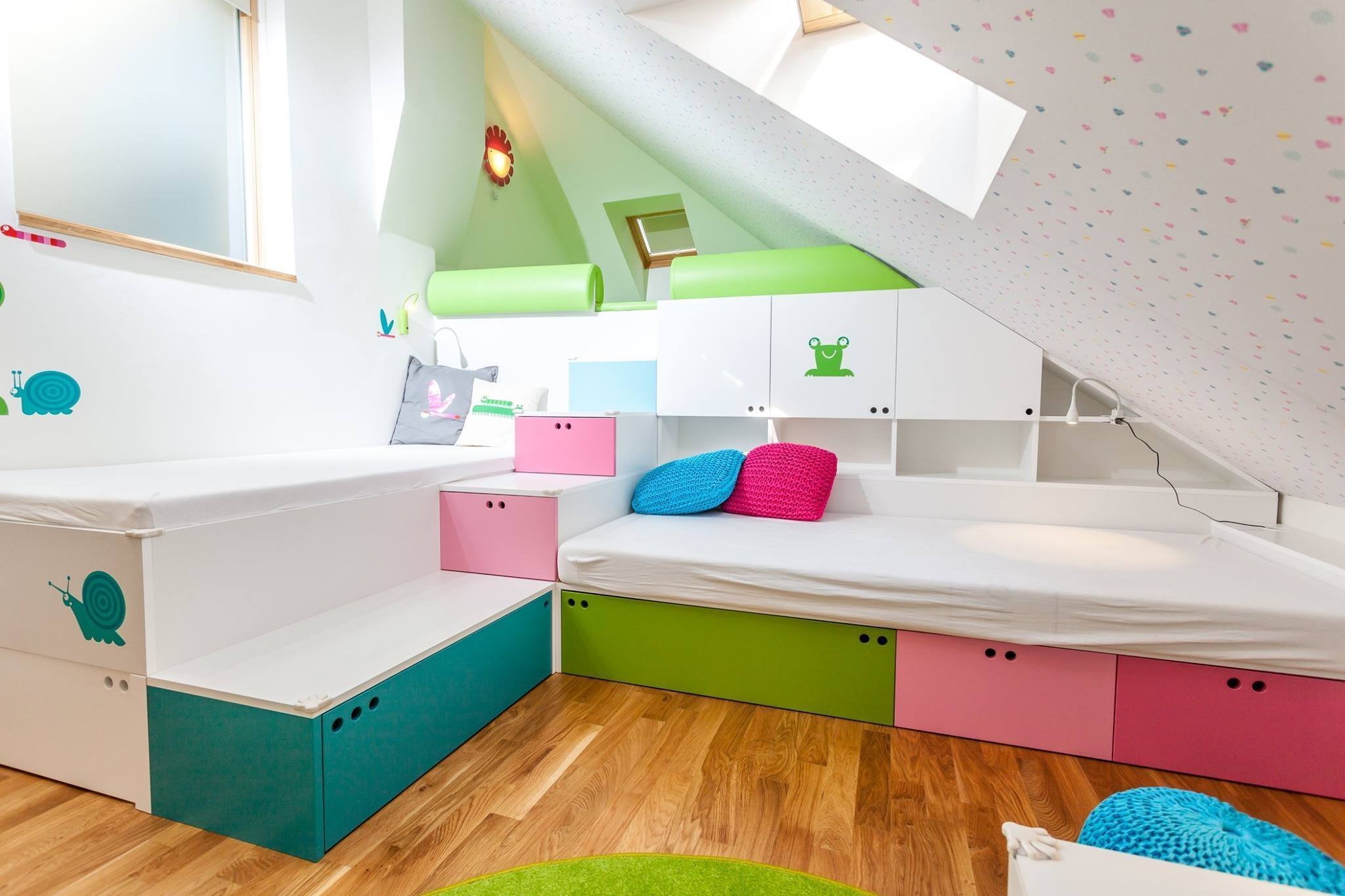 Dětský pokoj pro dvě malé děti v podkroví pětipatrového domu v Holešovicích je řešen stejně jako celý byt v různých výškových úrovních. Hraní u nízkého stolku na zemi, do vyšší postele se vstupuje ze schůdků a konečně nejvýše se vlézá do bunkru vystlaného molitanovou žíněnkou a zábranami na míru. V malém prostoru jsme maximálně využili všech možností pro ukládání, v postelích i schůdkách jsou zásuvky a boxy na hračky a knížky.