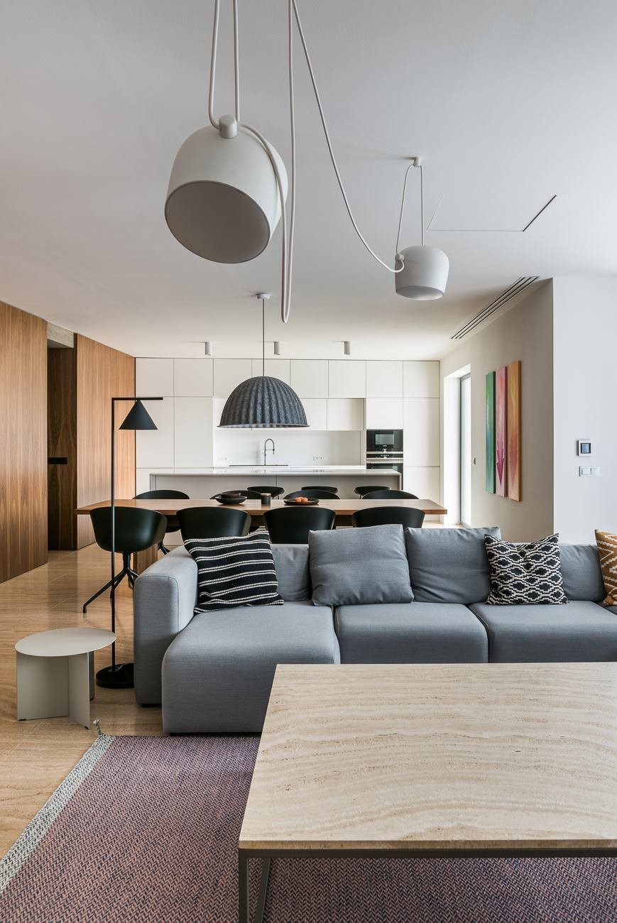 Velký prostorný byt, světlý interiér. Bílá barva, přírodní dřevo a travertin. Vše zázemí je důsledně integrované, zůstává pouze čistý obytný prostor, nic víc.