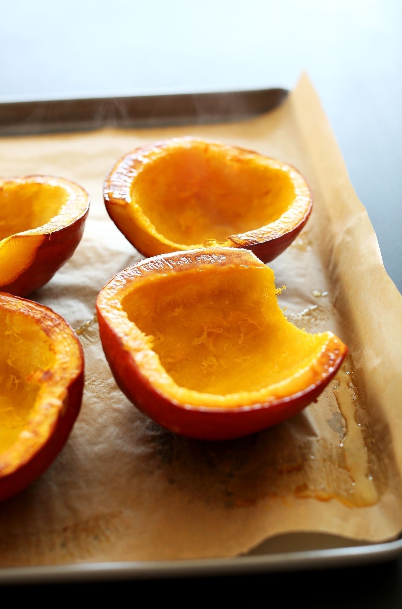 Nejdřív si nachystáme dýni. Tu důkladně opláchneme a velmi ostrým nožem opatrně rozřízneme napůl (toto je patrně nejsložitější krok z celého receptu, dýně je totiž velmi tvrdá a je třeba velké opatrnosti při jejím krájení). Lžící vydlabeme všechna semínka i vlákna, která se uprostřed dýně nacházejí.