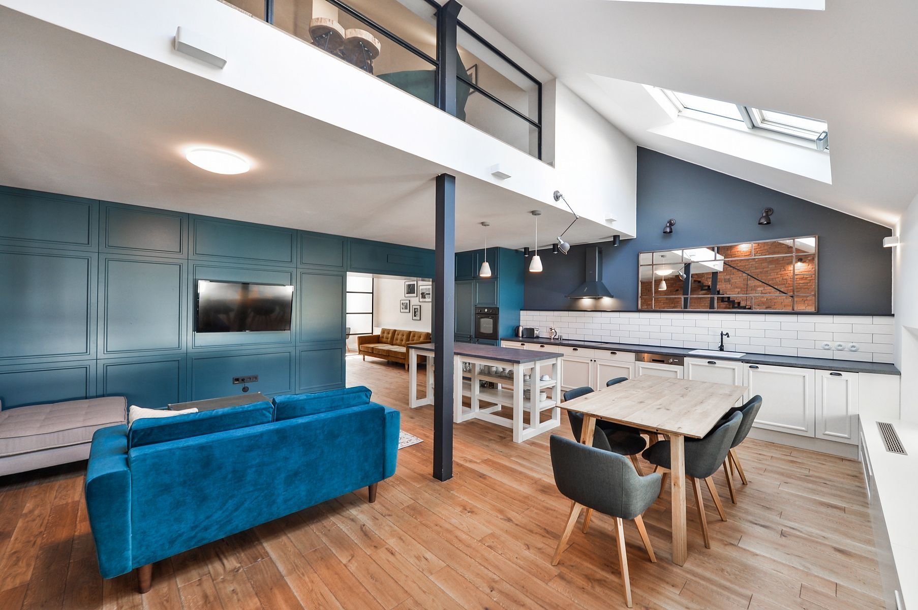 Po vstupu do bytu se dostaneme do předsíně, jejíž dominantou je hořčicově zabarvená pohovka. Odsud můžeme pokračovat skrze prosklené dveře do prostorného obývacího pokoje, jenž je spojen s kuchyňským a jídelním koutem. Dominantou tohoto prostoru je cihlová stěna, která v kombinaci s tmavě modrým dřevěným obkladem prostoru dodává na osobitosti a útulnější atmosféře. Kromě velkých oken je interiér osvětlen i industriálními svítidly nad kuchyňským ostrůvkem, dále pak světly na stěnách.
