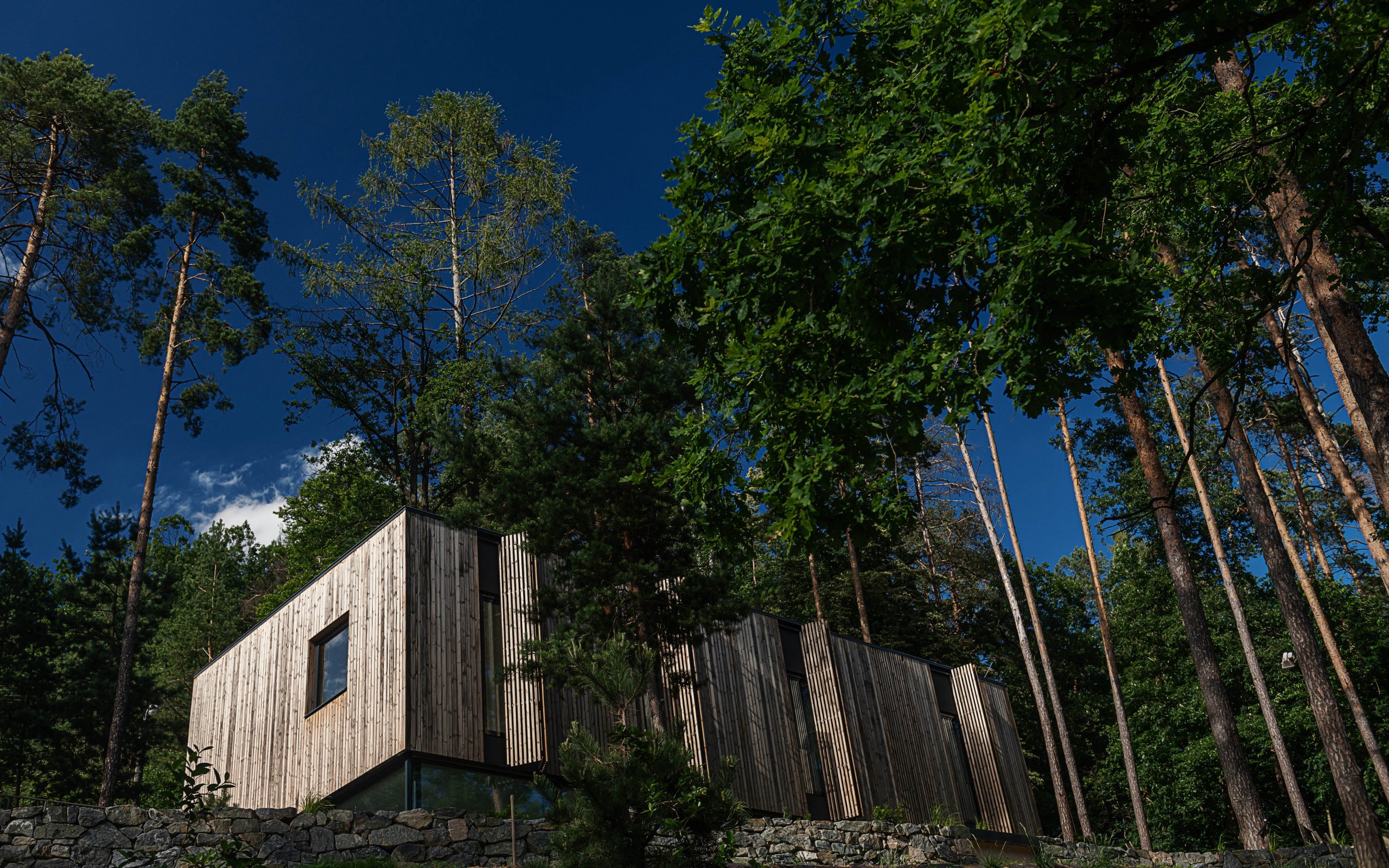 V překrásné krajině uprostřed stromů tak vyrostlo netradiční stavení, které však svým vzhledem odkazuje na lásku a respekt k přírodě. Proplétá se pod korunami štíhlých borovic a těší se ze své tajemné skrýše plné dechberoucích výhledů.