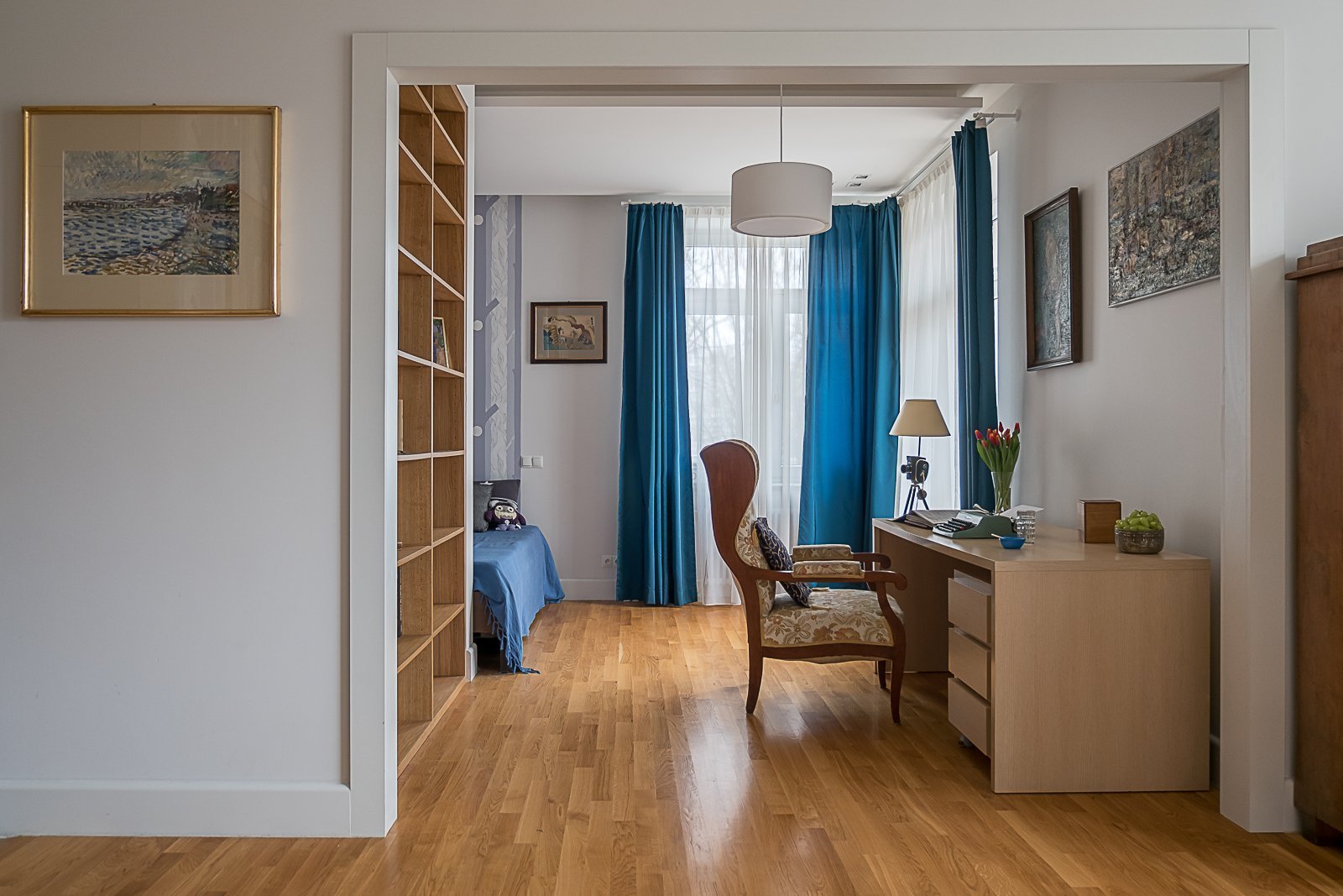 Nepochybnou výhodou tohoto bytu jsou velká okna, která do prostoru nesou jasné světlo. V kombinaci s modrými akcenty vytvářejí idylickou atmosféru. Moderní interiérové prvky jsou začleněny do prostoru tak, aby nebyly vidět, nebo aby dokonale ladily k historickým a přirozeným prvkům bytu.
