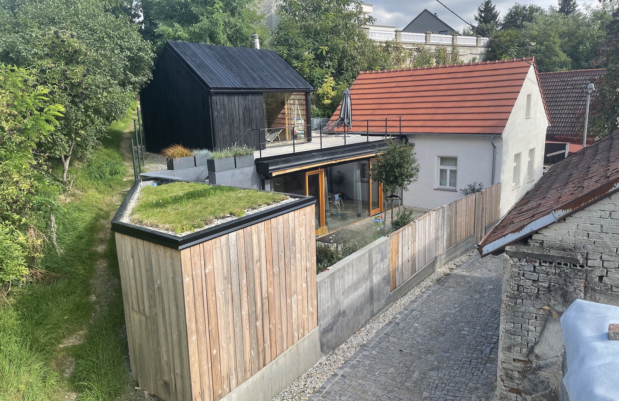 Po vyklizení domu se bohužel ukázalo, že rekonstrukce nepřipadá v úvahu. Muselo se bourat, což byl v malé vinařské uličce také oříšek. Na pomoc však přispěchal soused, který má stavební firmu a rovněž pro strach uděláno. Vrhl se na demolici na svažitém pozemku a brzy na to mohli manželé začít stavět. Od začátku přitom bylo jasné, že by nové stavení mělo nést prvky tradiční i moderní architektury. Venkovská chaloupka měla reflektovat tu původní s tím, že právě ona by fungovala jako obytný prostor. V moderní přístavbě pak měla vzniknout ložnice. Nakonec se však koncept pozměnil, a tak jsou naopak v domku dvě ložnice a velká koupelna, zatímco přístavba ukrývá otevřený prostor s kuchyní, jídelnou a obývacím pokojem.