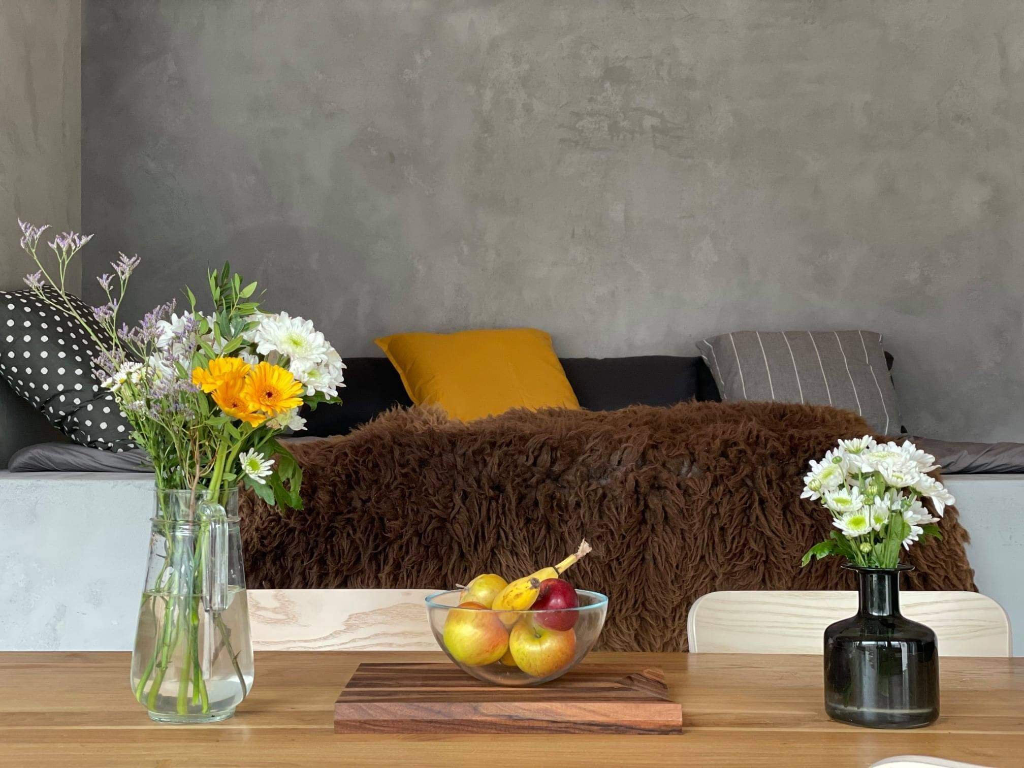 Bukovanská chaloupka dává velký prostor světlému dřevu, které umocňuje příjemnou atmosféru v interiéru. Skvěle tak zapadá do skládanky bílé, šedé a černé barvy. Majitel a architekt v jednom se spolu s manželkou opravdu nebál experimentovat. A že se jejich blízcí plánu s černou omítkou v obývacím prostoru zpočátku báli… Nakonec však byli všichni překvapeni, jak pěkně ladí se šedým krbem a komínem.
