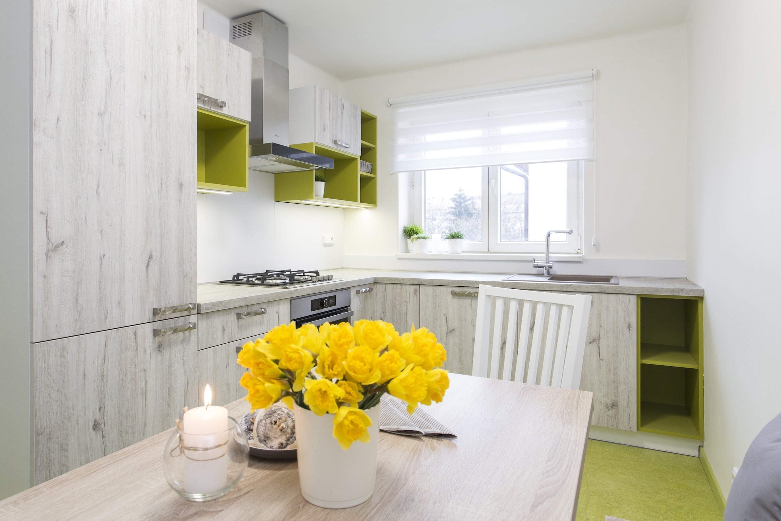 Ve stejném duchu se nesla i rekonstrukce kuchyně. K propojení místnostní bylo na podlahu použito marmoleum v limetkové zelené barvě. Krytina v dětském pokoji je ze sametového vinylu. Výhodou je dobře omyvatelný povrch příjemný na dotek. Adélka si oblíbila šedou barvu, proto je pokoj laděn v těchto odstínech a je doplněn o hořčicově žluté prvky. Kvůli malému prostoru je postel pro dceru vyšší, aby se pod ní se vešly úložné skříně. Zároveň je v pokoji rozkládací pohovka s velkou ložnou plochou.