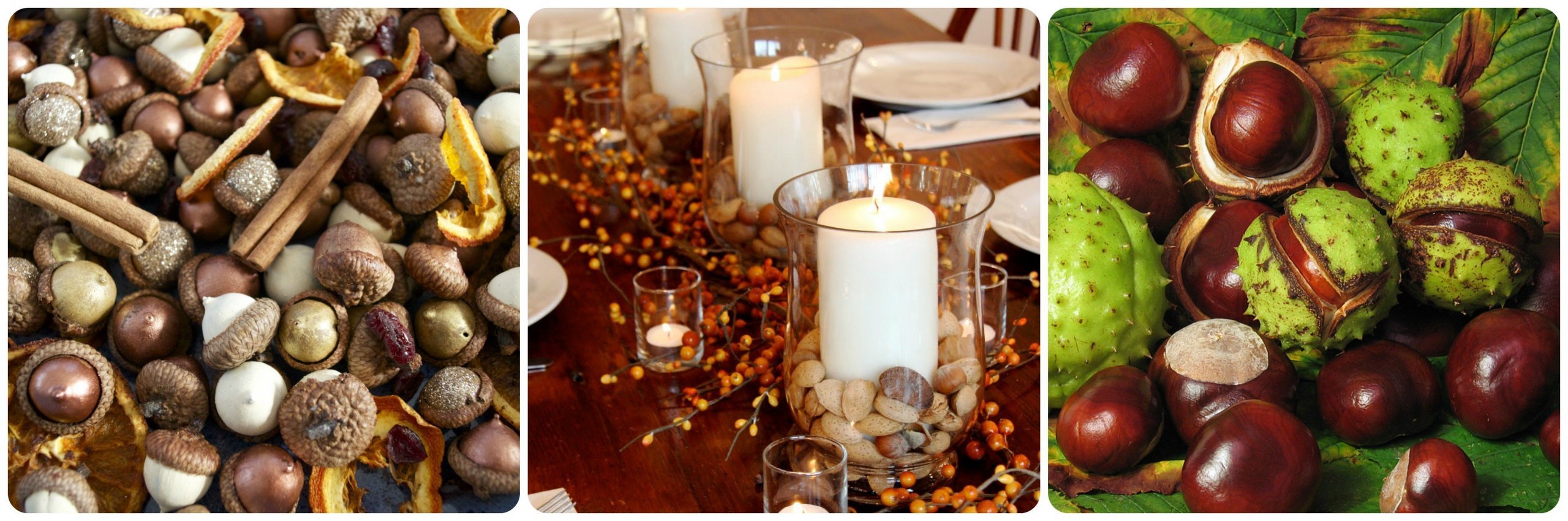 Oříšky jsou nejen dobré a zdravé, ale také krásně vypadají a nikdy nezvadnou. Také kaštany jsou oblíbené svou sytou barvou, jejich povrch se nádherně leskne. No a letošním hitem jsou žaludy, ovšem trochu vylepšené! Krása spočívá v detailech. Uvidíte, jak krásně se bude na stole vyjímat miska plná drobných, nabarvených žaludů. Dalším tipem je tyto poklady podzimu nasypat do vysoké, průhledné vázy. Jsou přece krásné samy o sobě.