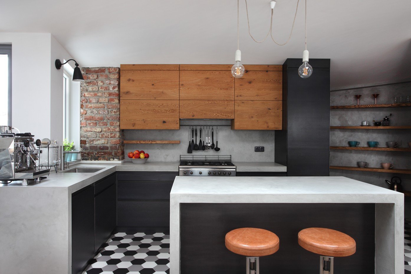 Jelikož se inspirací pro tuto realizaci stal styl newyorského loftu, celým interiérem prochází beton, dubové dřevo a kovové prvky. Přírodní materiály se zde zajímavě doplňují s lehce industriálním nádechem. O originalitu bydlení se vedle této příjemné symbiózy starají i designové kusy nábytku. K těm patří zejména masivní jídelní stůl dovezený z Indie či toaletní stolek ve vintage stylu v ložnici. Netradičně řešená je také podlaha v obytném prostoru, seskládaná z geometrických dlaždic, které se jakoby vlévají do dřevěné části. Zájmu hostů jistě neujde ani zajímavě koncipovaná kuchyň, která je originálem vyrobeným na míru z masivního dřeva, hrubého kovu a betonové stěrky. Za povšimnutí stojí rovněž šatna z kombinace dřeva a kovu, která se otevírá do ložnice, či půvabná terasa. Výsledkem je tedy mimořádně stylové bydlení v decentně industriálním stylu. Ten umocňuje přiznaný cihlový komín, který spolu s dalšími obdobnými prvky evokuje populární loftové bydlení.