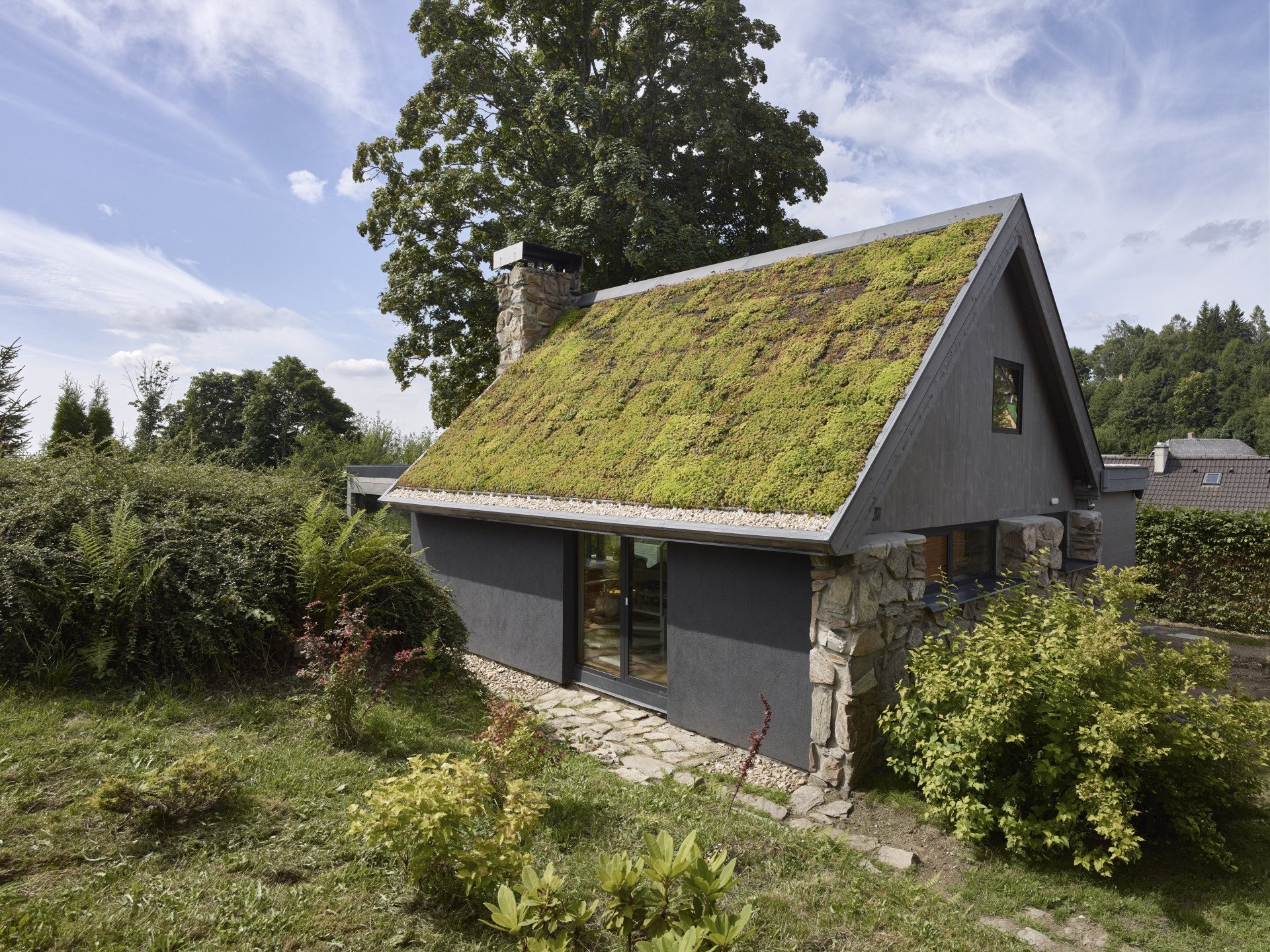 V exteriéru naopak hrají prim přírodní tóny. Největší ozdobou nově zrekonstruované chaty je přitom zelená střecha. Nejenže pomáhá zadržovat vodu v krajině, ale také tomuto stavení umožňuje splývat s okolím. Pozornosti kolemjdoucích jistě neunikne ani výrazný kamenný komín. K dokonalosti pak přispívá překrásná bujná zahrada plná stromů, keřů a lučních květin.