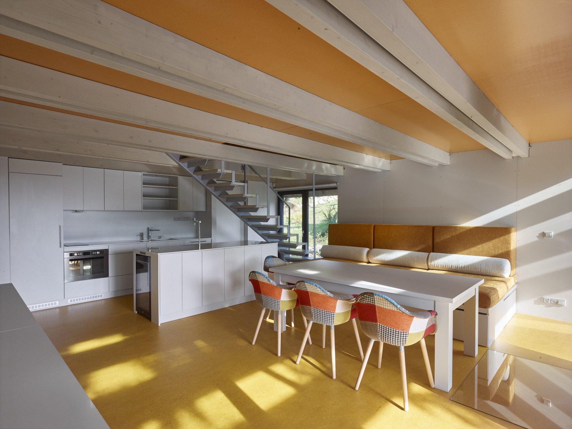 Zimní zahrada se nachází v samotném čele stavby. Díky zasklení v subtilních černých rámech může dovnitř pronikat dostatek přirozeného světla a obyvatelům se rovněž nabízí bezpočet krásných výhledů do krajiny. Nejenže architekti původní chatu doplnili o dvě přístavby, ale také ji celou zateplili. V dostatečně světlém a teplém interiéru se vedle zimní zahrady nachází obývací pokoj propojený s kuchyní a jídelnou, koupelna a dvě ložnice. Do těch je možné vystoupat po kovovém schodišti, které tu bylo ještě před rekonstrukcí. Interiér chaty je příjemně svěží, za což vděčí zejména jasně oranžovým podlahám, které doplňuje bílý nábytek.