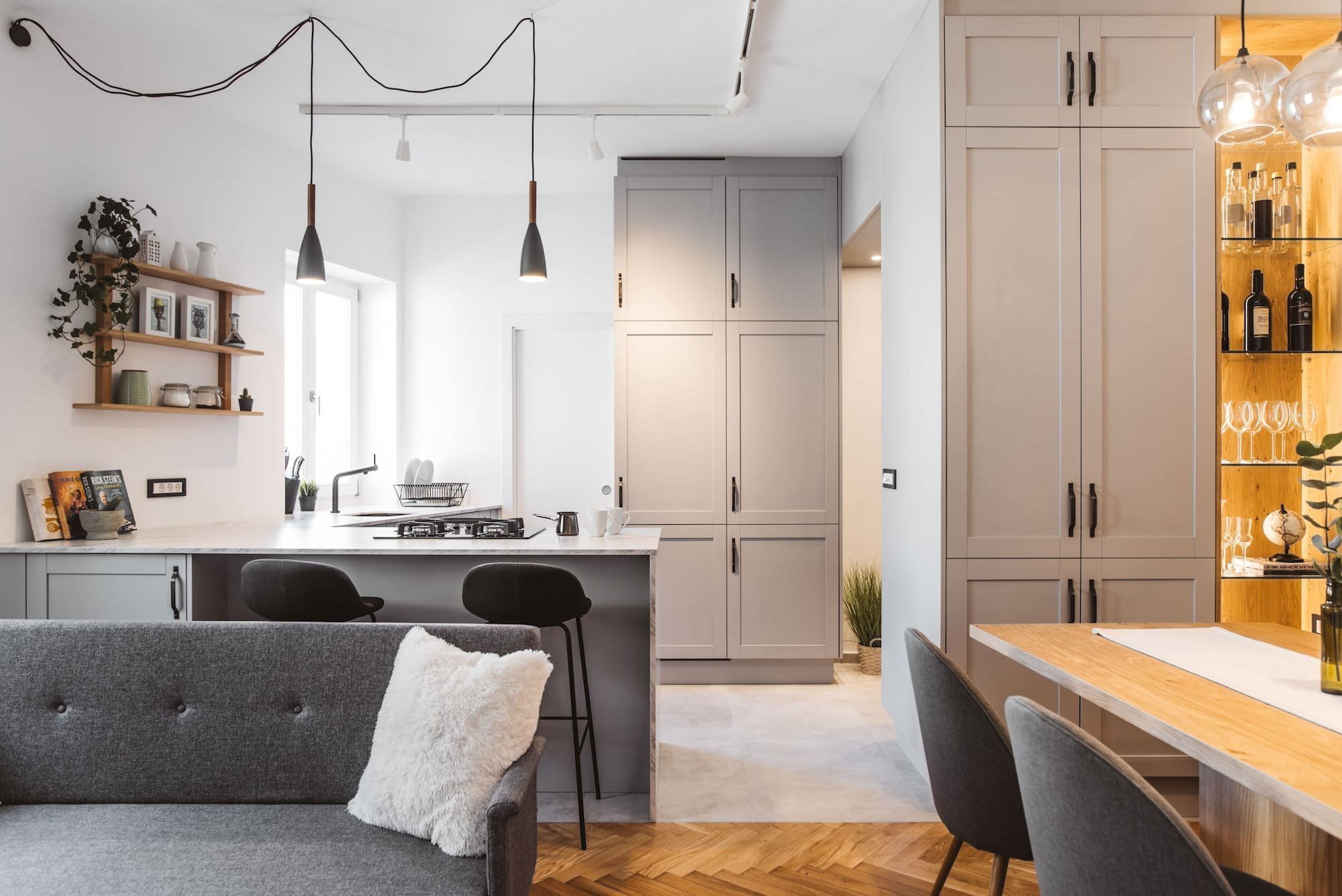 Starý nábytek byl nahrazen interiérovými doplňky na míru, které dodaly bytu moderní nádech. Oba architekti byli nicméně opatrní, aby konečný vzhled nebyl příliš sterilní. V bytě dominují neutrální tóny, bílá a šedá v kombinaci se dřevem. Místnosti byly také oživeny výběrem světel, od stropních po samostatně stojící. V chodbě, která je maximálně využívána, je skříň instalovaná až ke stropu, s inteligentně umístěnými závěsnými prvky v průchodu do kuchyně. Chodbu oživuje také zrcadlo namontované na kuchyňskou skříň. V koupelně a kuchyni jsou doplňky a příslušenství v černé barvě a desky působí dojmem mramoru. Podle přání majitelů byla kuchyň zvětšena a opatřena kuchyňským ostrůvkem. Ten vznikl vytvořením přepážky, ve které je lednice a další úložný prostor. Opticky se oddělí kuchyně od obývacího pokoje. Kuchyně je rustikální ve světle šedé barvě s černými držadly a pracovní deskou vyrobenou z cenově dostupné imitace ultra mramoru.