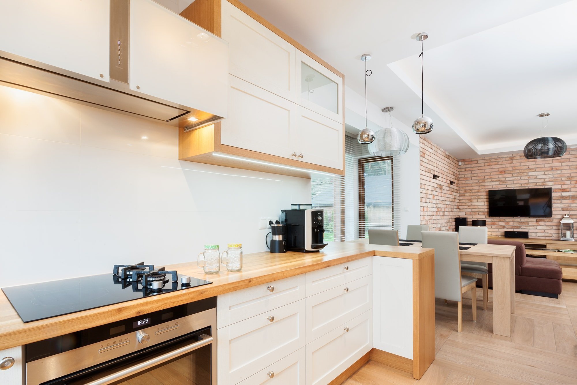 Kuchyně je směsicí moderního stylu s mírně rustikálním. Architekti zde navrhli kuchyň s profilovanými dvířky, knopkami, masivní pracovní deskou a vystupujícím keramickým dřezem. Místo obkladu je použito praktické tvrzené sklo a pracovní prostor osvětlují LED pásky v horních skříňkách.