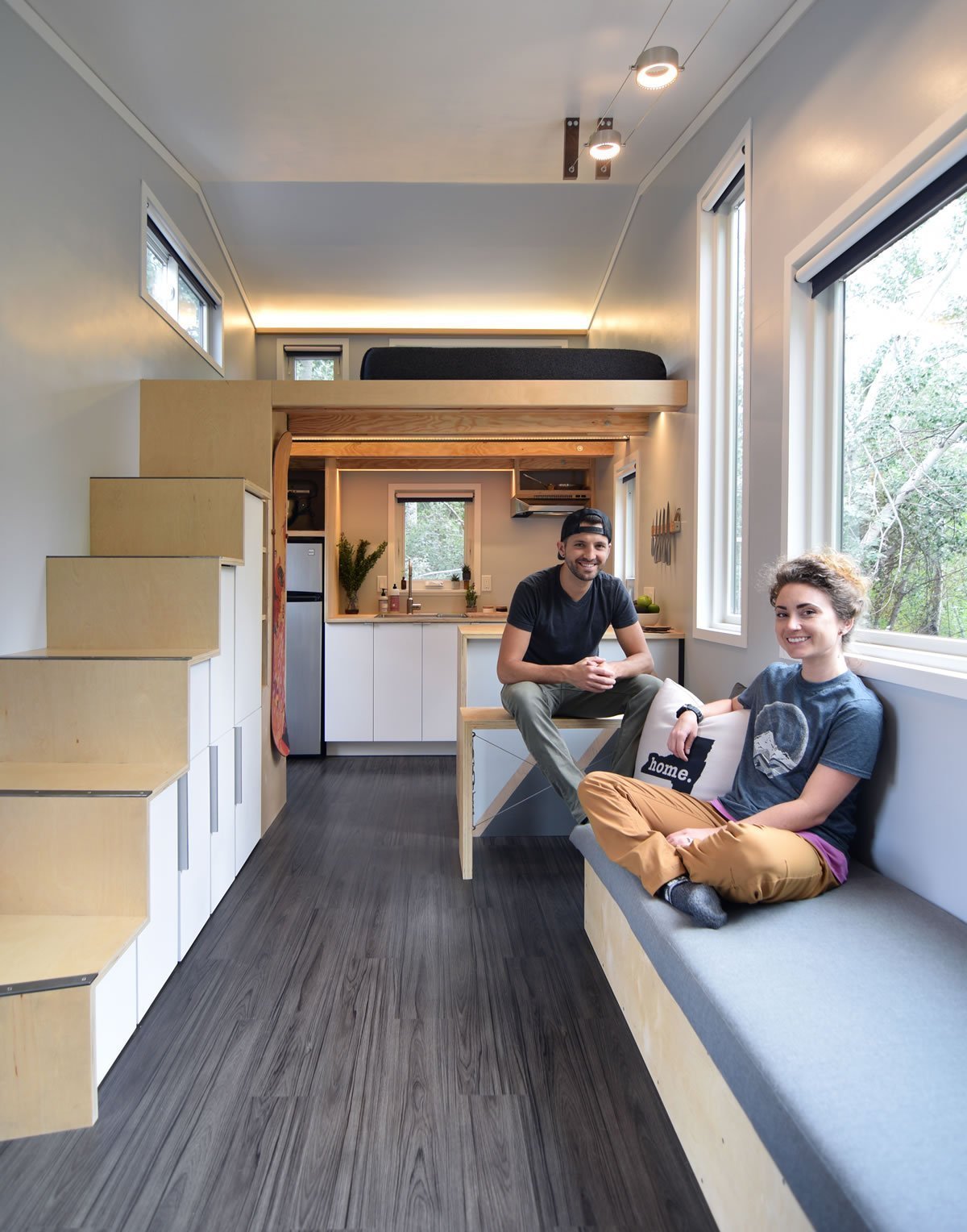 Mladý americký pár si vlastními silami postavili tento mobilní domek s názvem Shed. Pracovali na něm po víkendech necelých 14 měsíců. O tom že dokázali využít každý centimetr čtvereční, není pochyb. Kromě ložnice, obývacího pokoje, malinkaté koupelny i prostorné kuchyně zde můžete najít komoru, ve které mají majitelé uložené sportovní i turistické vybavení. Domek je vybaven velkými prosklenými okny a dveřmi, které vevnitř zajišťují dostatek světla a disponují žaluziemi pro zajištění soukromí.