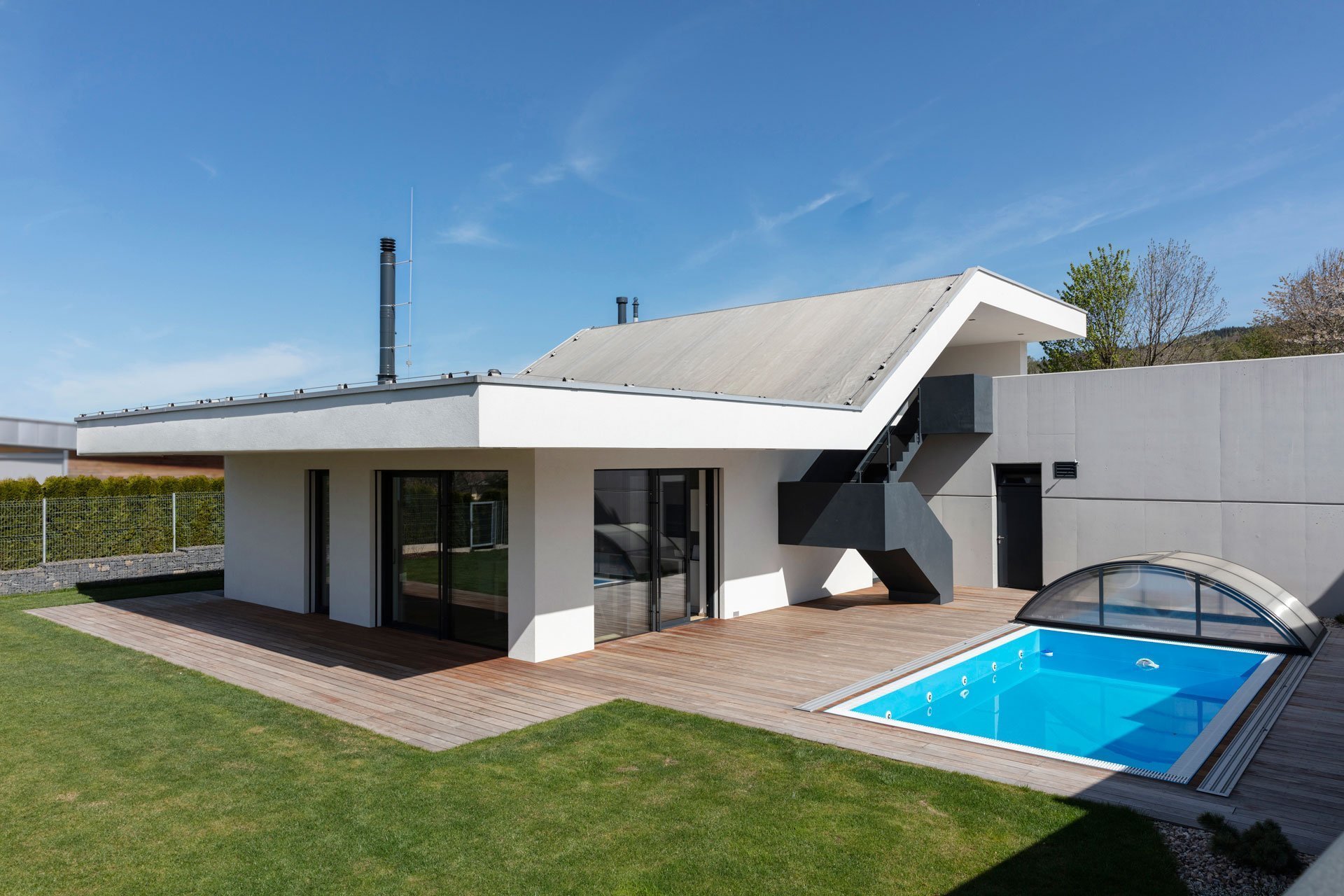 Z hlavní chodby je rovněž možné vejít do dvou dětských pokojů, sociálního zázemí a ložnice, disponující vlastní koupelnou a toaletou. Technická místnost a garáž pro dva osobní automobily byly navrženy do horního podlaží. Předprostor garáže nabízí venkovní kryté stání pro další dvě vozidla a dostatečný prostor pro manipulaci s nimi.