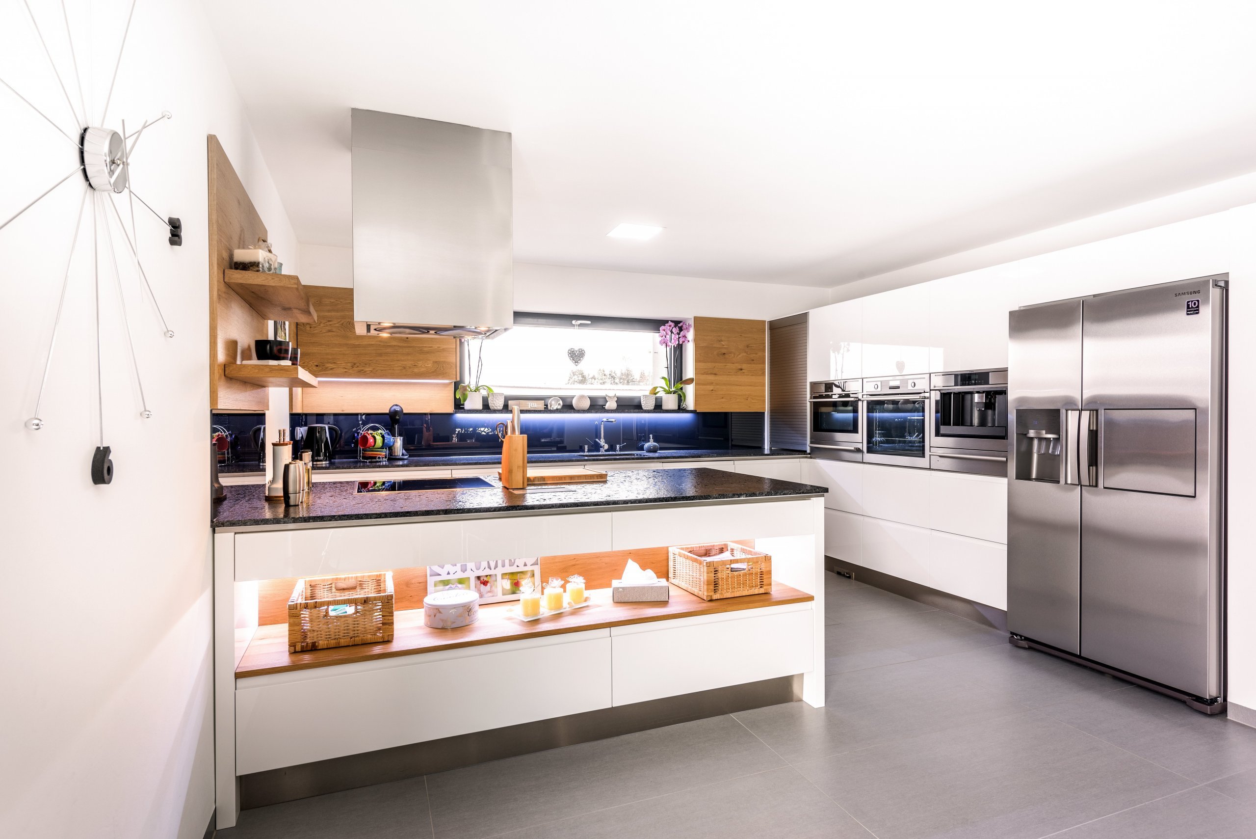 Kuchyně Pure rozzaří i váš dům. Trojkombinace trouby, mikrovlnky a kávovaru v ideální obslužné výšce. Dvoukřídlá americká lednička přímo po ruce. Jednolitý blok skříní zakončený nikou. Bílé plochy se střídají s dubovým obkladem, navazující ostrůvek a pracovní plochy jsou pokryty žulou, parapet je podsvícen efektním LED systémem. Všechno je zde dokonale naplánováno, aby vás výsledek pokaždé příjemně překvapil.