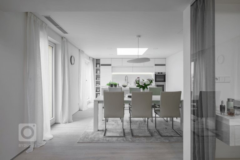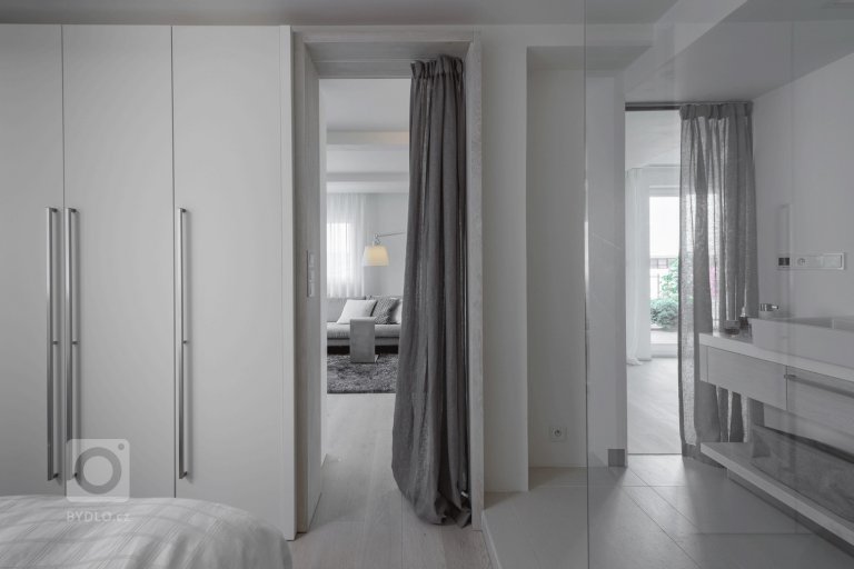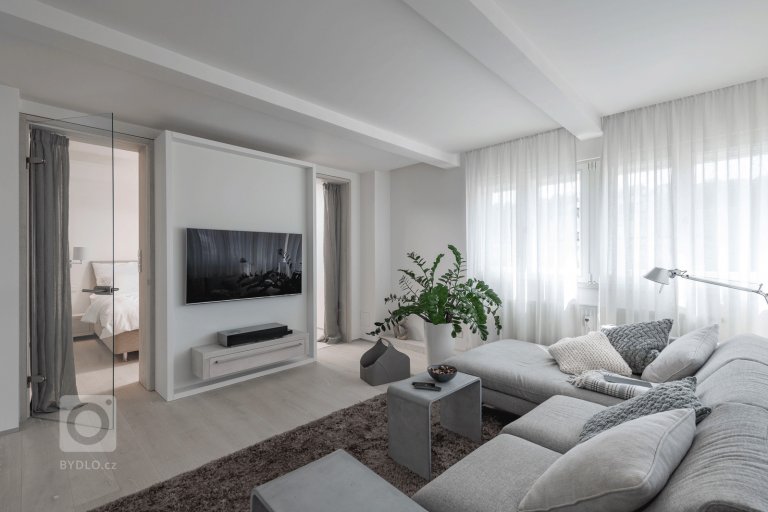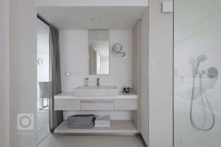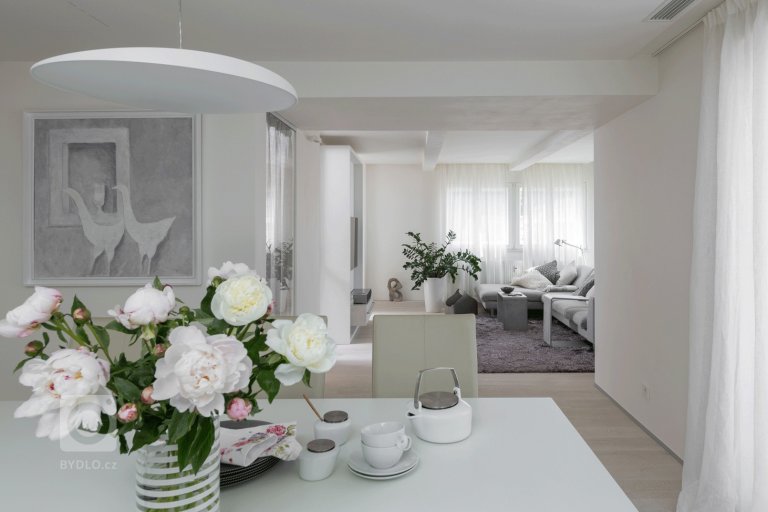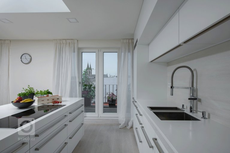 Z bývalé – velmi zdevastované – prádelny pod střechou prvorepublikového domu vznikl malý byt pro časté cesty manželského páru do Prahy. Místo pro setkávání s dospělými dětmi, pro přespání po divadelním představení nebo schůzce: otevřený interiér pro dva, kuchyň s jídelnou, pohodlné sezení, ložnice propojená s koupelnou, volné průhledy bytem i malá terasa kolem něj. Decentní barvy a měkké textilie vytvořily důstojné prostředí pro obraz Vladimíra Komárka.