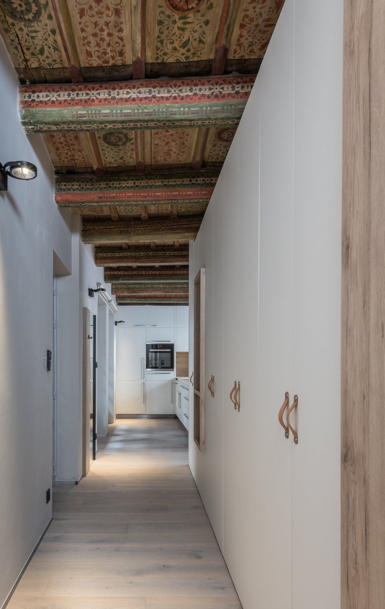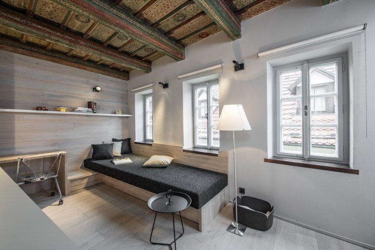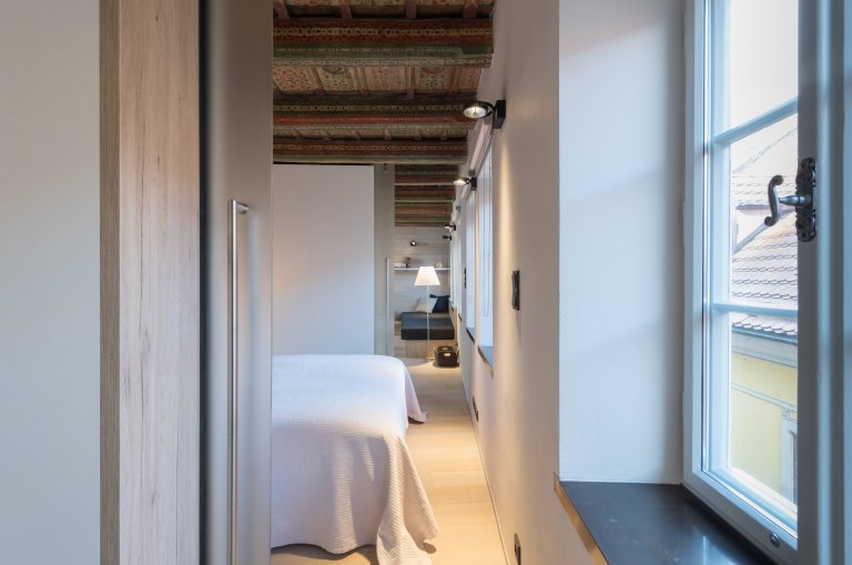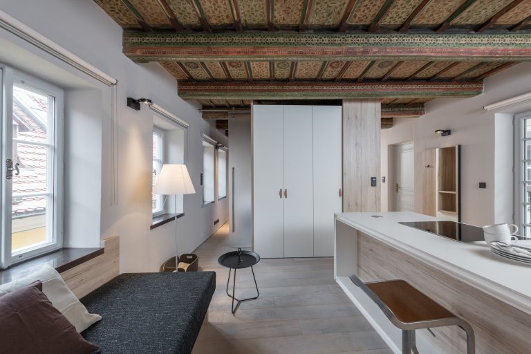 Romantický byt v uličce pod Pražským hradem. Tento byt s původním dřevěným malovaným stropem, vkusně zrekonstruovaný dle návrhu architektonického studia I.D. Arch, leží ve 3. patře historického malostranského pavlačového domu.