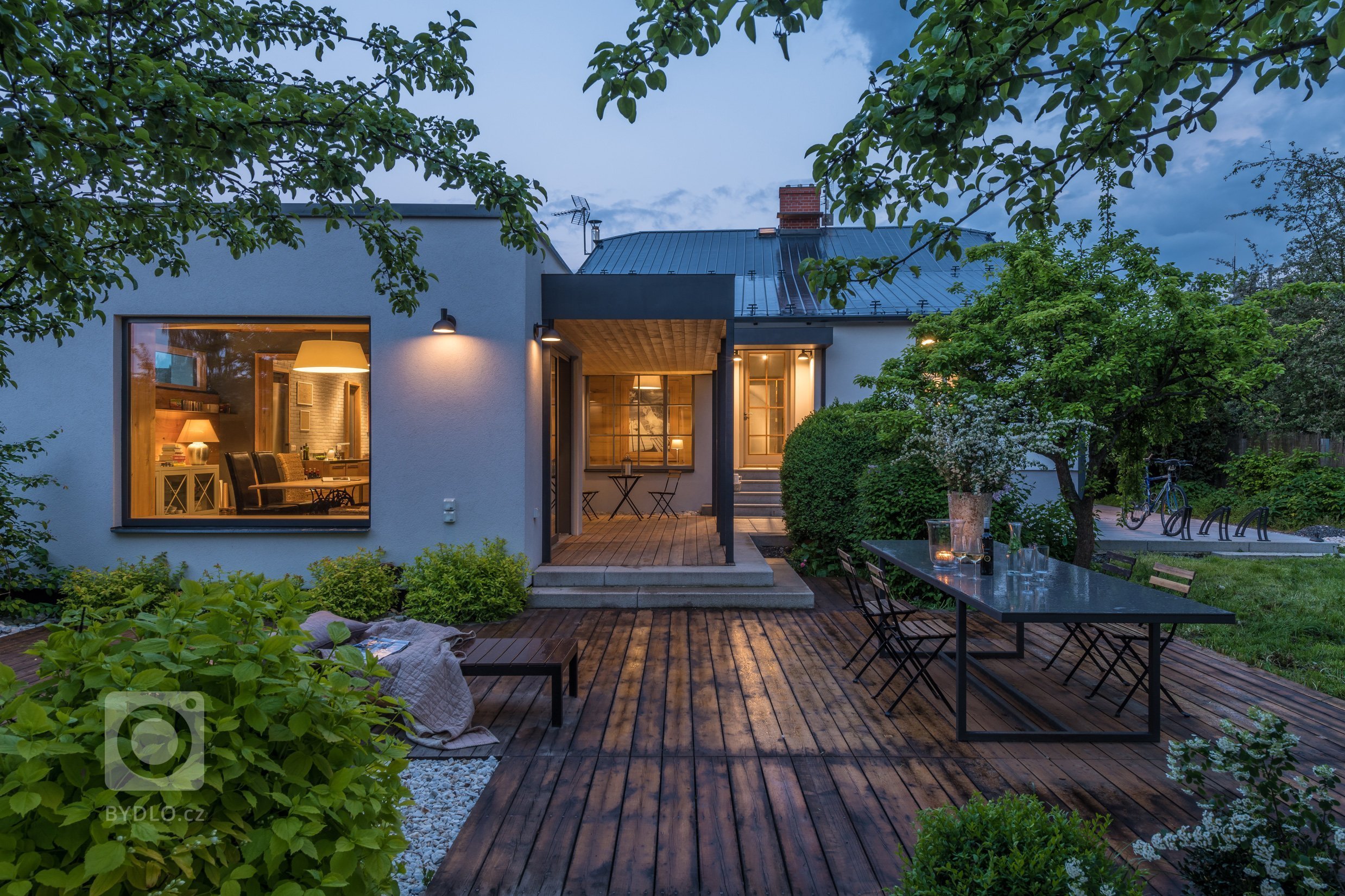 Starý dům svou velikostí nemohl splnit požadavky klientů, neumožnil ani vytvoření velkého obytného prostoru. Při rekonstrukci zde byla vybudována soukromá zóna ložnic s pracovnou, šatnou a hygienickým zázemím. Velkorysá kuchyň s jídelnou vznikla v nové přístavbě: přízemní pavilon stojí uprostřed…