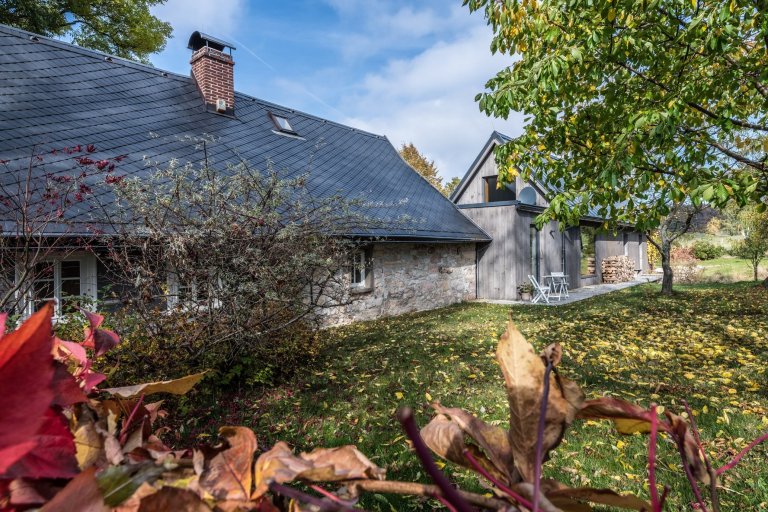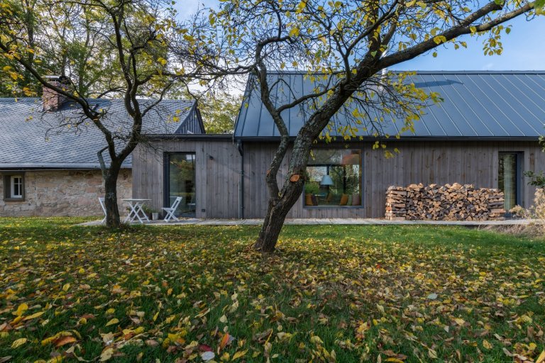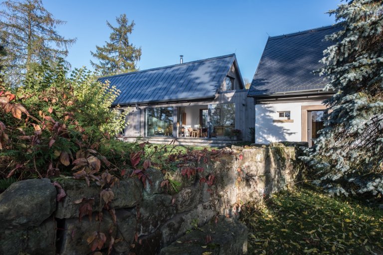 Majitelé roubenky si přáli využívat ji celoročně, ale potřebné zateplení by zničilo původní vzhled. Rozhodli se proto roubenku citlivě zrekonstruovat a využívat přes léto pro soukromí návštěv. Za jejími zády postavili dům nový, který poskytuje veškerý komfort také v zimě. Dům dodržuje místní regulace, respektuje tradiční venkovskou zástavbu a materiály zapadá do okolního prostředí, přesto je už na první pohled současný.