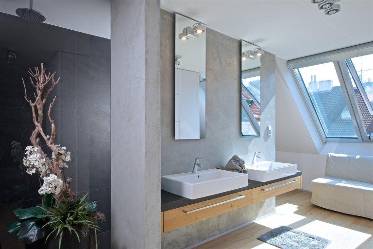 Náš dlouholetý kamarád a klient k nám přivedl své přátele, kteří právě rekonstruovali dvoupodlažní půdní prostor. O studii a projektu, dle kterého rekonstrukce probíhala, začínali mít ve fázi, kdy vznikaly příčky, pochybnosti. Zajímalo je, zda umíme do vznikajícího prostoru navrhnout vzdušný, praktický, účelně vybavený, útulný a zároveň zemitý interiér.