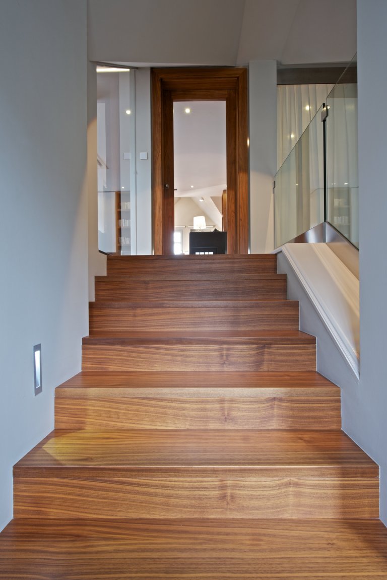 Konstrukce krovu byla zdravá, ale velmi členitá vzhledem ke složité mansardové střeše. Klienti si přáli dosáhnout „uhlazenějšího“ celku bez trámových konstrukcí. Se všemi sloupy a všemi složitými vodorovnými dřevěnými vazbami bylo potřeba se vypořádat, nechat je „zmizet“ v nábytkových dílcích, které zároveň zajistily členění prostoru na denní část (obývací pokoj) kuchyň, relaxační část (vana s TV a výstupem na terasu), pracovnu, ložnici, koupelnu a šatní úložné prostory skryté i pod šikminami.