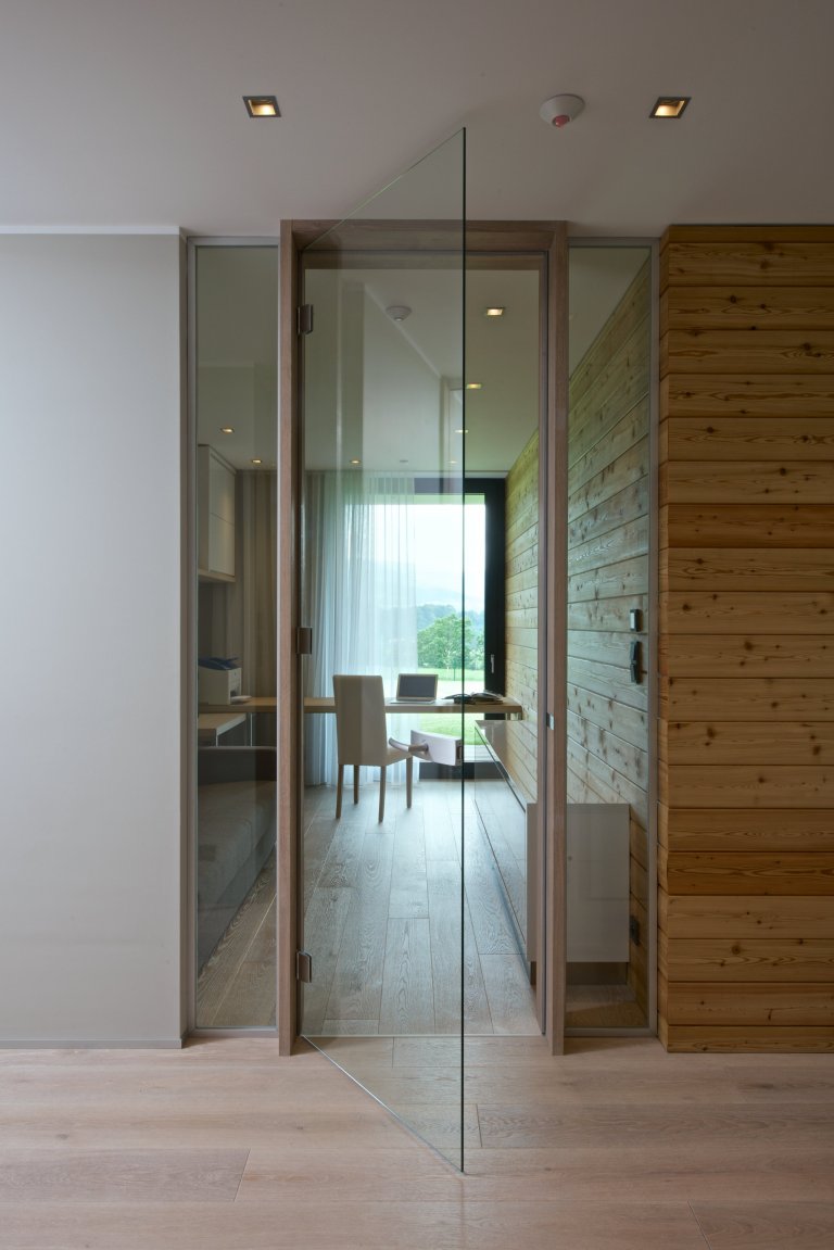 Při cestě do hlavní obytné části se otevírá jižní pohled na Beskydy přes skleněné plochy (pracovna, venkovní sezení pod střechou). Kuchyně je propojena s jídelnou i odpočinkovým sezením u krbu, navazuje na ni wellness křídlo s toaletou, sprchou, saunou a odpočinkovým ležením. Výhledy jsou na venkovní zastřešené sezení na jihovýchodě až po západní panorama. Pracovna sloužící jako příležitostný hostovský pokoj „uzavírá“ společnou část, za posuvnými skleněnými dveřmi jsou dva pokoje dětí, koupel dětí a koncové křídlo rodičů...Jeden celek zahrnuje ložnici, koupel i šatnu.