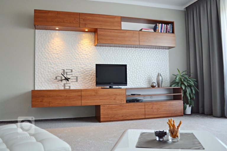Obývací stěna se spoustou úložného prostoru je v malém bytě vždy výhodou.