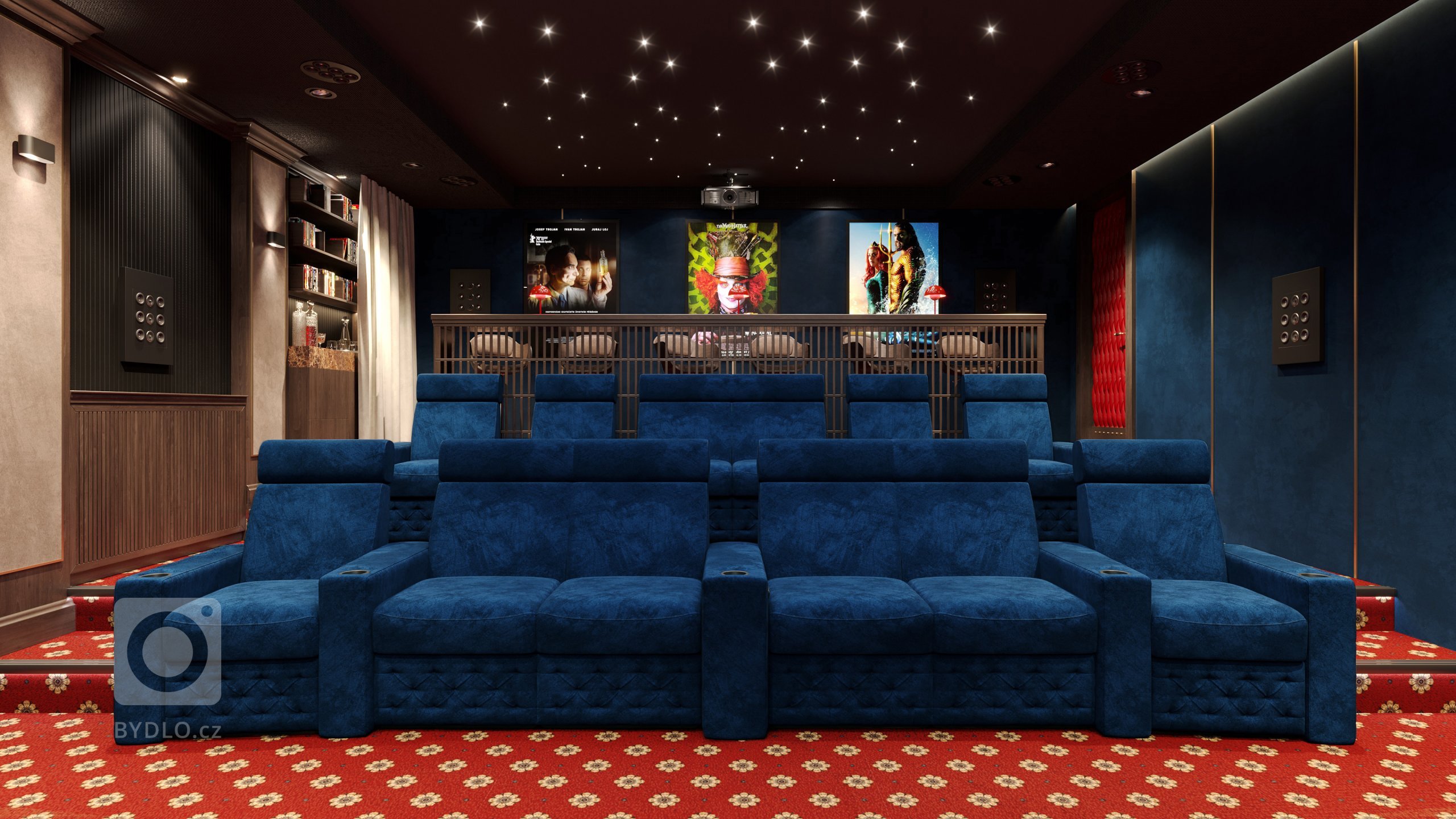 Architektonický návrh interiéru kina. Jedná se o vestavbu domácího kina v suterénu rodinné vily. Zadáním bylo vytvořit tak trochu kýčovité americké kino z 60. let. Audiovizuální řešení navrhla firma VOIX, Dušní 3. Vizualizace: Karel Buhr