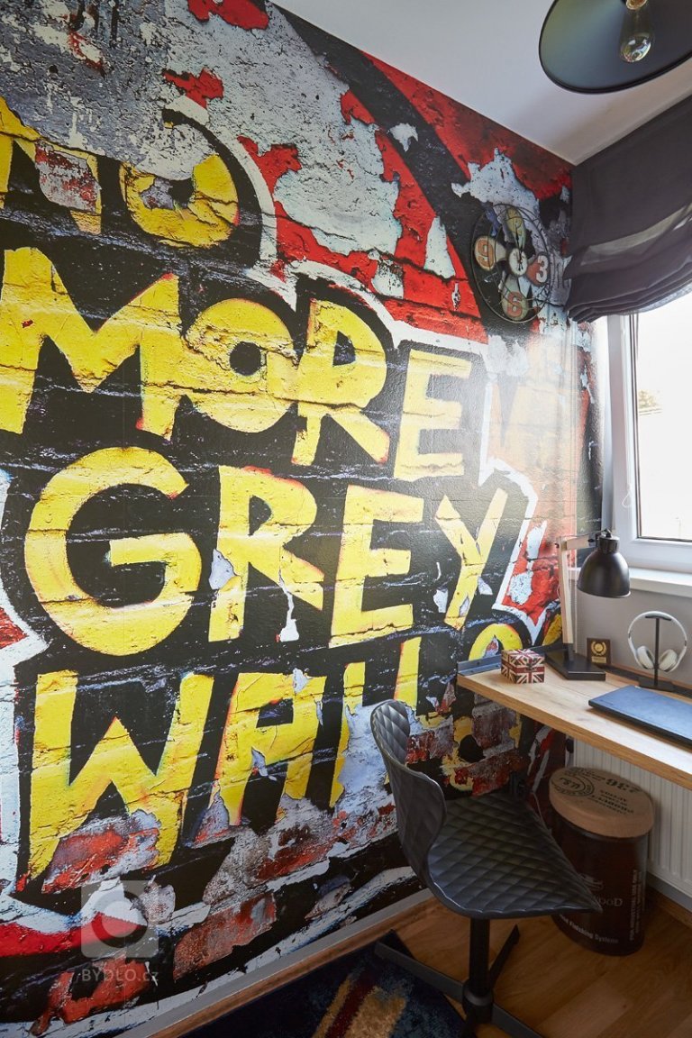 Neustále opakující se otázka, co vlastně dáme na tu nudnou šedou stěnu naproti posteli, mě inspirovala k pořízení výrazné fototapety s důraznou odpovědí: NO MORE GREY WALLS!