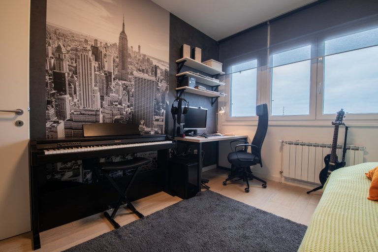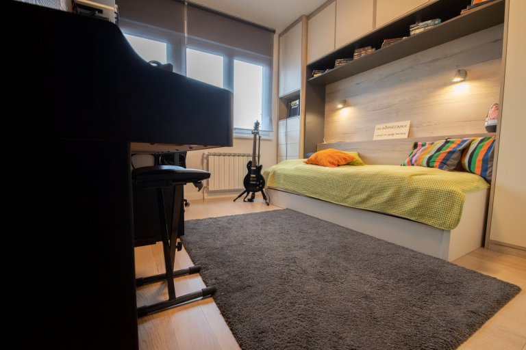 Interiér studentského pokoje pro mladého nadaného hudebníka. Zvolené barvy odráží věk a povahu studenta. I přes to, že vestavěný nábytek poskytuje dostatek úložného prostoru působí vzdušně a nenápadně.