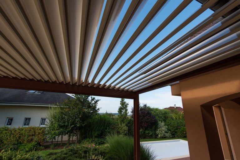 Realizace pergoly v Dobříči vznikla díky spolupráci se společností Technorol. K domu byla přistavěna hliníková pergola s bioklimatickými funkcemi. Zastřešení je tvořeno naklápěcími lamely a přední stěna je doplněna o screenovou roletu ve světlé barvě. Majitelům tak pergola zajištuje absolutní úkryt před sluncem, vítrem, deštěm a dokonce i sněhem. Aby pergola korespondovala se vzhledem domu, byl zvolený hnědý odstín hliníkových nosnic. Z dálky tak může působit, že pergola je tvořena ze dřeva. Díky hliníkovému provedení však odpadá veškerá starost a údržba, která je běžně s dřeveným altánem spojena.