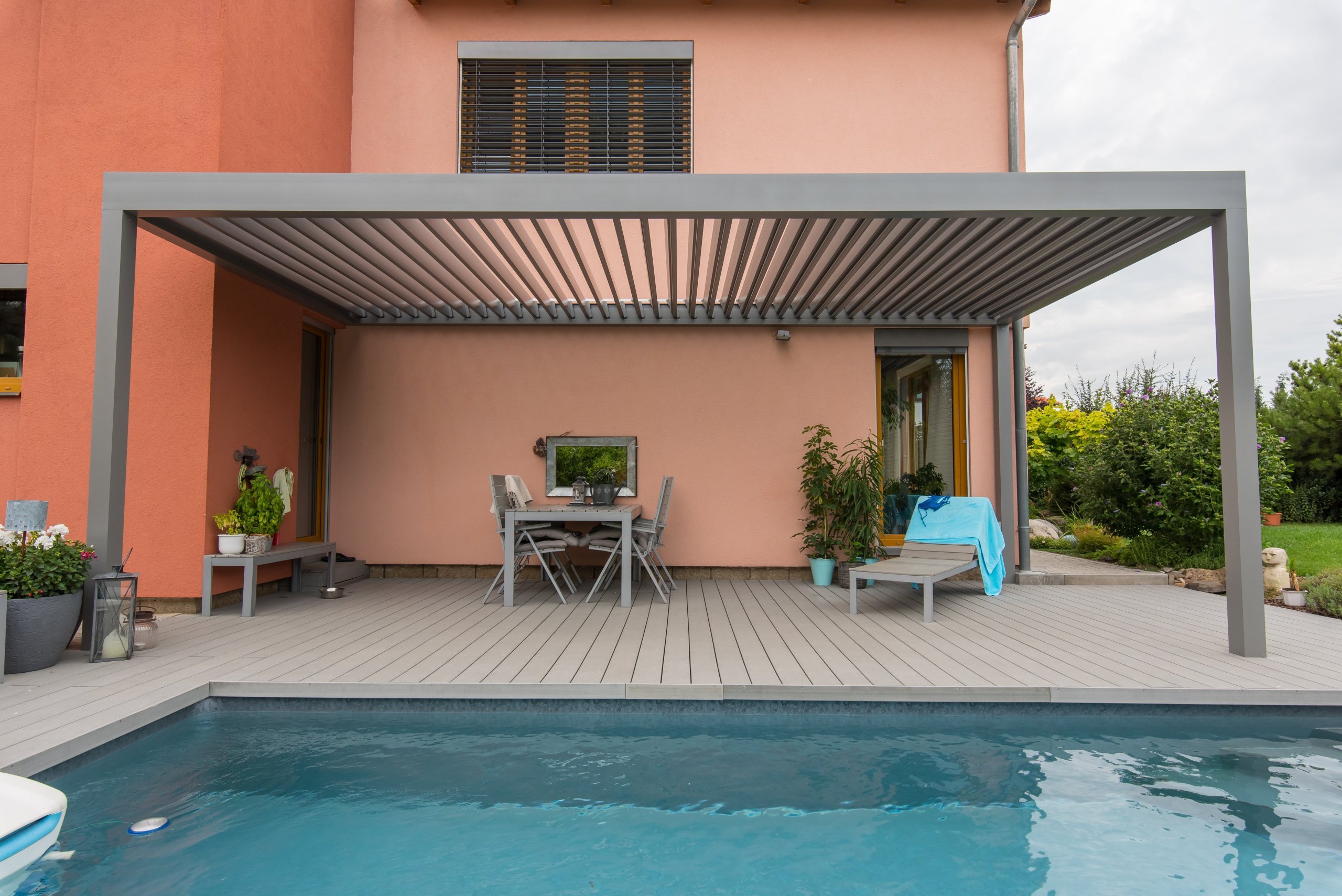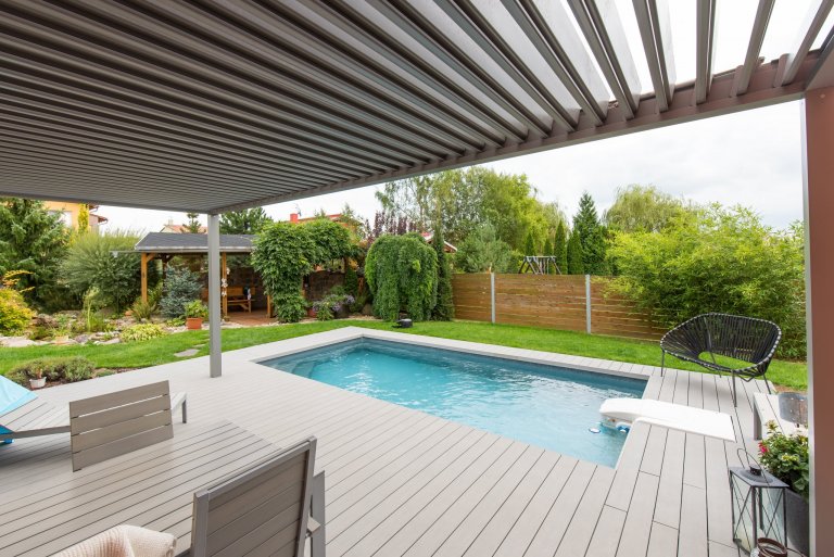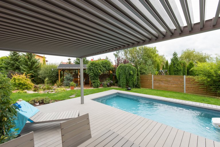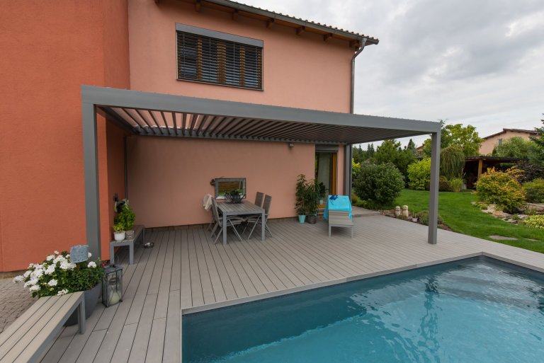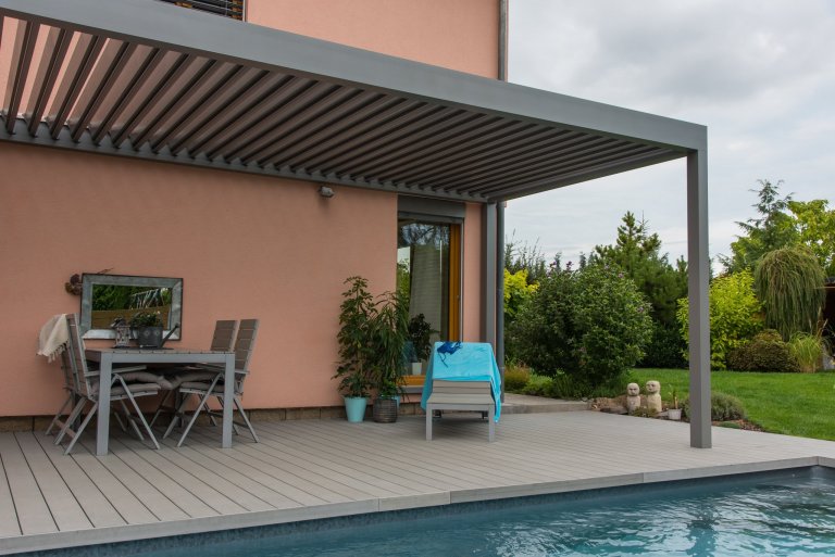 Majitelům k dokonalé zahradě scházel už jen přístřešek, který by nabídl ochranu ve všech ročních obdobích. Proto jsme navrhli hliníkovou pergolu, která díky svým bioklimatickým funkcím zajišťuje pohodlí jak v slunných, tak i v sychravých dnech. Odstín pergoly je v souladu s venkovní podlahou i zahradním nábytkem a působí tak velmi jemně.