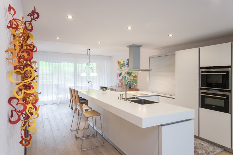 Byt 3+kk ve švýcarském Heidenu je součástí malého bytového komplexu zasazeného do krásného prostředí plného zeleně. V interiéru je kladen důraz na přírodní materiály a vyváženou kompozici barev. Pozitivní ladění interiéru podtrhují designové plastiky z dílny Christine Habermann a obraz Lubora Drgáče.