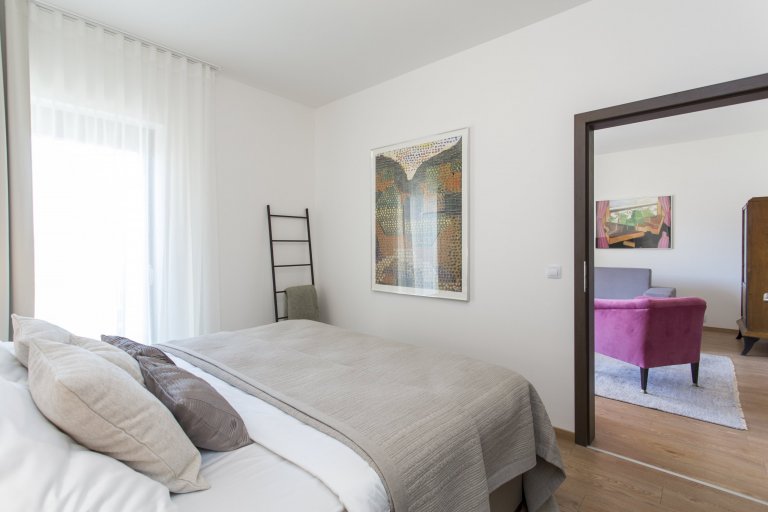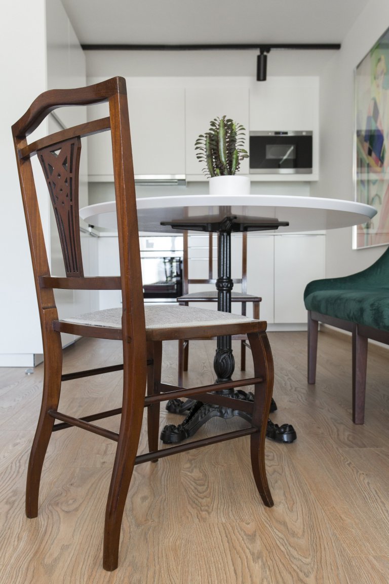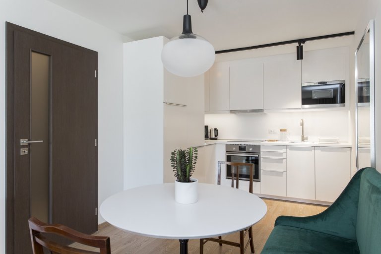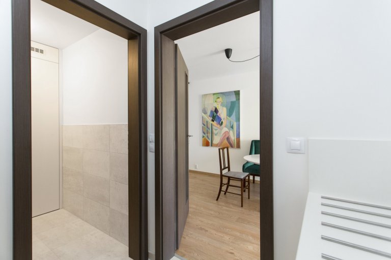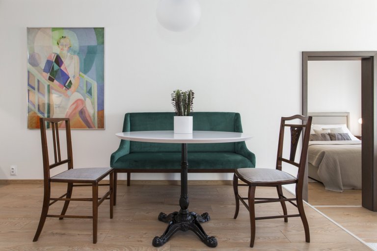 Návrh bytu 2+kk v pražské novostavbě byl ovlivněn jedinečným českým stylem - kubismem. Stěny bytu jsou zdobeny reprodukcemi kubistických umělců a ze stejného období pochází také skleník, jehož náročné kubistické tvarosloví společně s dalšími kusy historizujícího vybavení udává prostoru požadovaný směr. Barevnost bytu vychází z umístěných kubistických reprodukcích a propojuje tak stylově rozmanité vybavení interiéru.