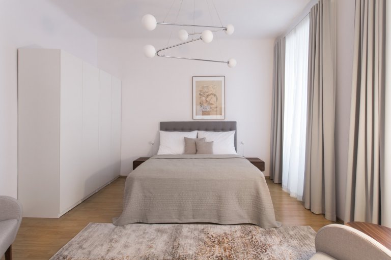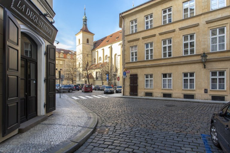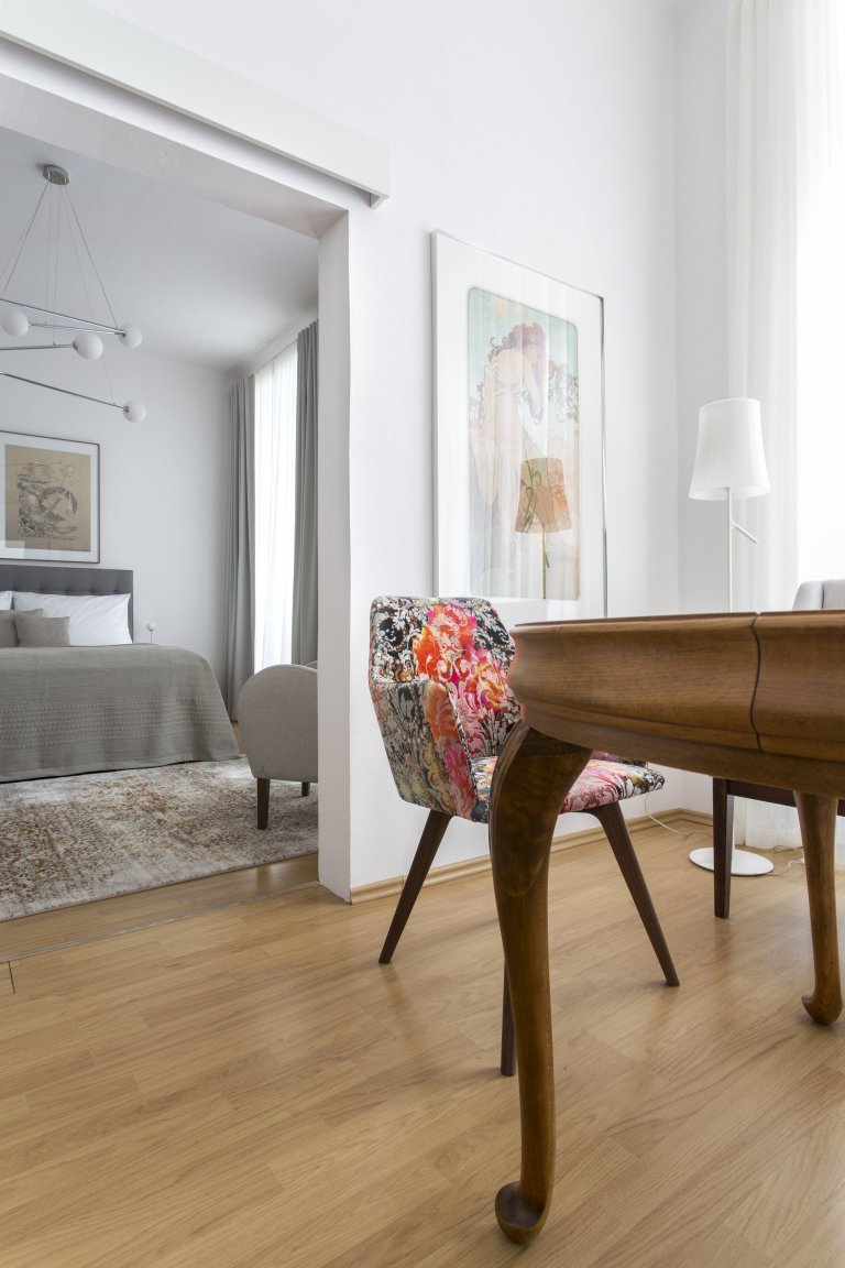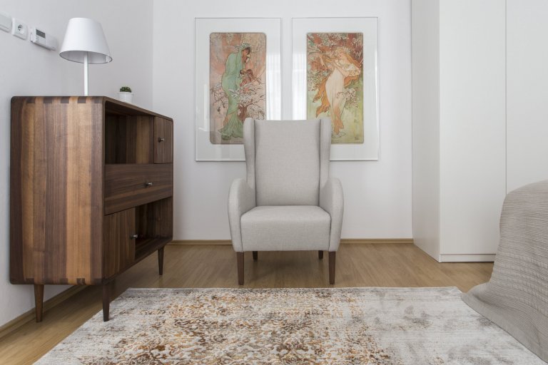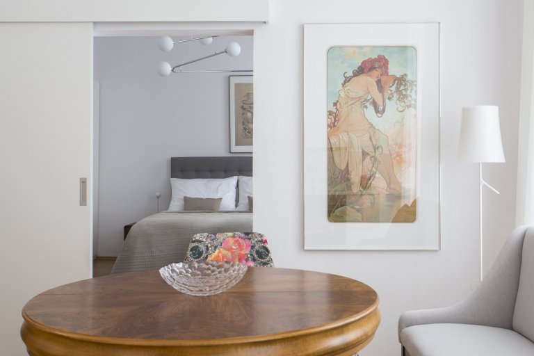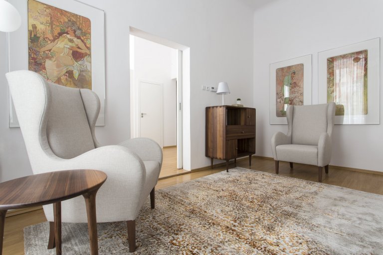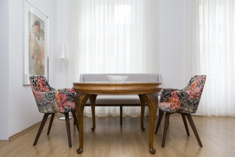 Byt se nachází v samém srdci historické Prahy, v měšťanském domě U modré boty v Haštalské čtvrti.Naším záměrem bylo vytvořit elegantní interiér, který podtrhne autentickou atmosféru památkově chráněné budovy. Ačkoliv prostor skrýval svůj potenciál pod silnými stopami opotřebení od předchozích obyvatel, věděli jsme, že z něj bude krásné místo k bydlení.Vstupní hala se díky své velikosti mohla proměnit v odpočinkovou zónu s knihovnou. Dostatek světelných zdrojů společně s hořčicově žlutým odstínem potahu sedačky tuto část bytu příjemně rozjasňuje. Centrálním místem bytu je kuchyně s jídelnou. Té dominuje starožitný jídelní stůl s pohodlnou polstrovanou lavicí a dvěma křesly. Barevné potahy křesel a tvarosloví nábytku jsou zásadní dekorací jinak jednoduše řešeného prostoru. Ložnice se nese v klidných světlých tónech šedé a béžové, se kterými krásně kontrastuje masivní ořechový nábytek řady Handmade od firmy Situs. Ten se prolíná celým bytem. Oblé křivky nábytku a reprodukce Alfonse Muchy dávají celému prostoru jemný a osobitý charakter.