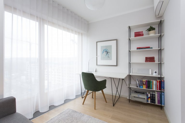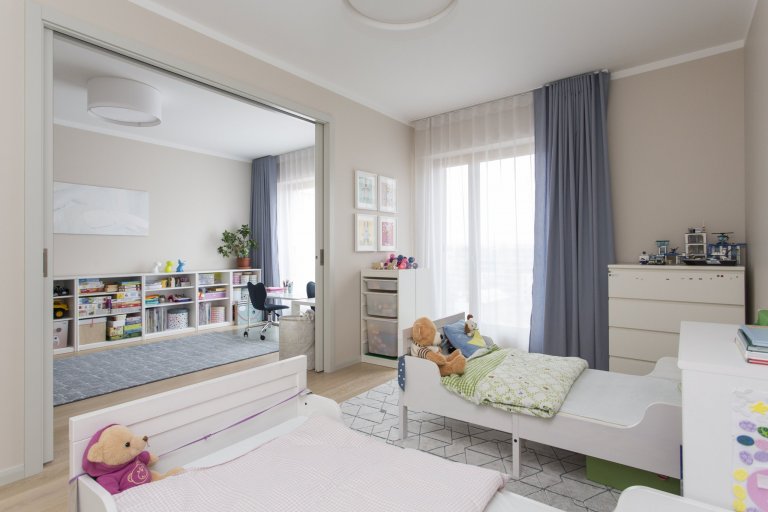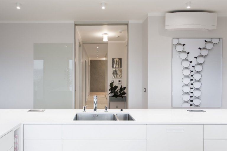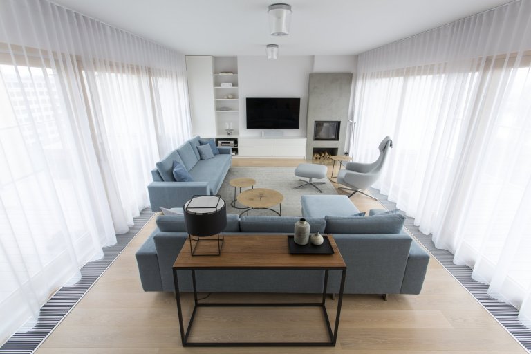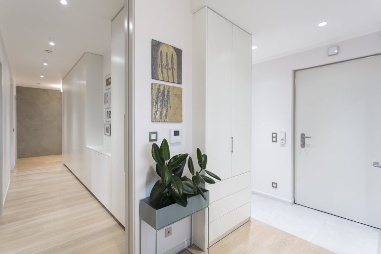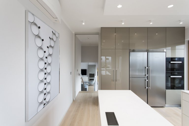Velkometrážní byt v posledním patře rezidenčního projektu Vltava má jedinečný výhled na řeku Vltavu a protilehlé panorama starých Holešovic. Čisté linie, vzdušnost a světlost a v neposlední řadě dostatek úložných prostor byly hlavními tématy při řešení tohoto interiéru. Velkoryse koncipovaná moderní kuchyně má nejkrásnější výhled z celého bytu a je zároveň nejobývanější místností. Minimalistické tvary a precizní provedení kuchyňské linky se zde setkávají s vřelostí přírodního materiálu stolové desky vyrobené ze dvou kusů masivního dřeva, jehož hrany přiznávají tvar kmenu. Obývací pokoj s terasami po obou stranách jsme navrhli s ohledem na praktické požadavky klientů tak, aby vynikly jeho čisté linie a zachovala se tak jednoduchost prostoru. Jemné barevné ladění kontrastuje s hrubostí betonové stěrky, která v kombinaci s velkoformátovou fotografií vytváří příjemné drama. Stylový a nadčasový interiér je navzdory reprezentativnímu vzhledu praktický a plní nároky pětičlenné rodiny. Většina vybavení je pro maximální využití prostoru vyrobena na míru. Finální podobě návrhu pomohla skutečnost, že jsme s klienty nespolupracovali poprvé a jejich osobní preference a nároky jsme znaly z předchozí spolupráce.