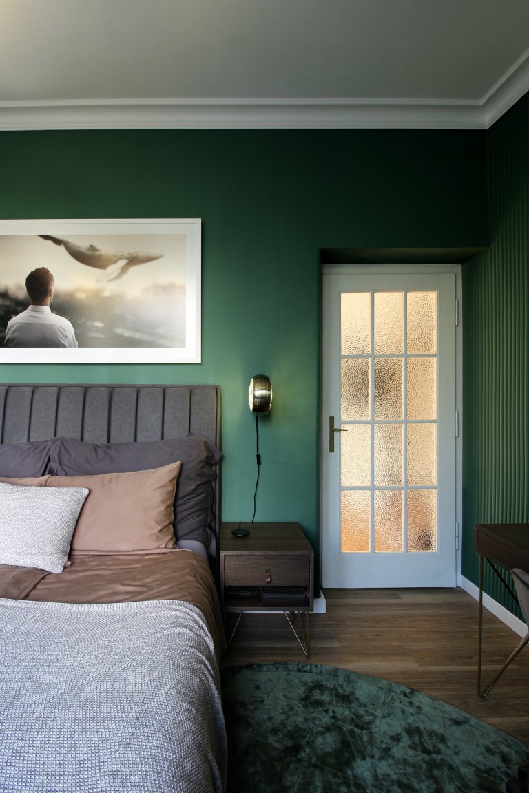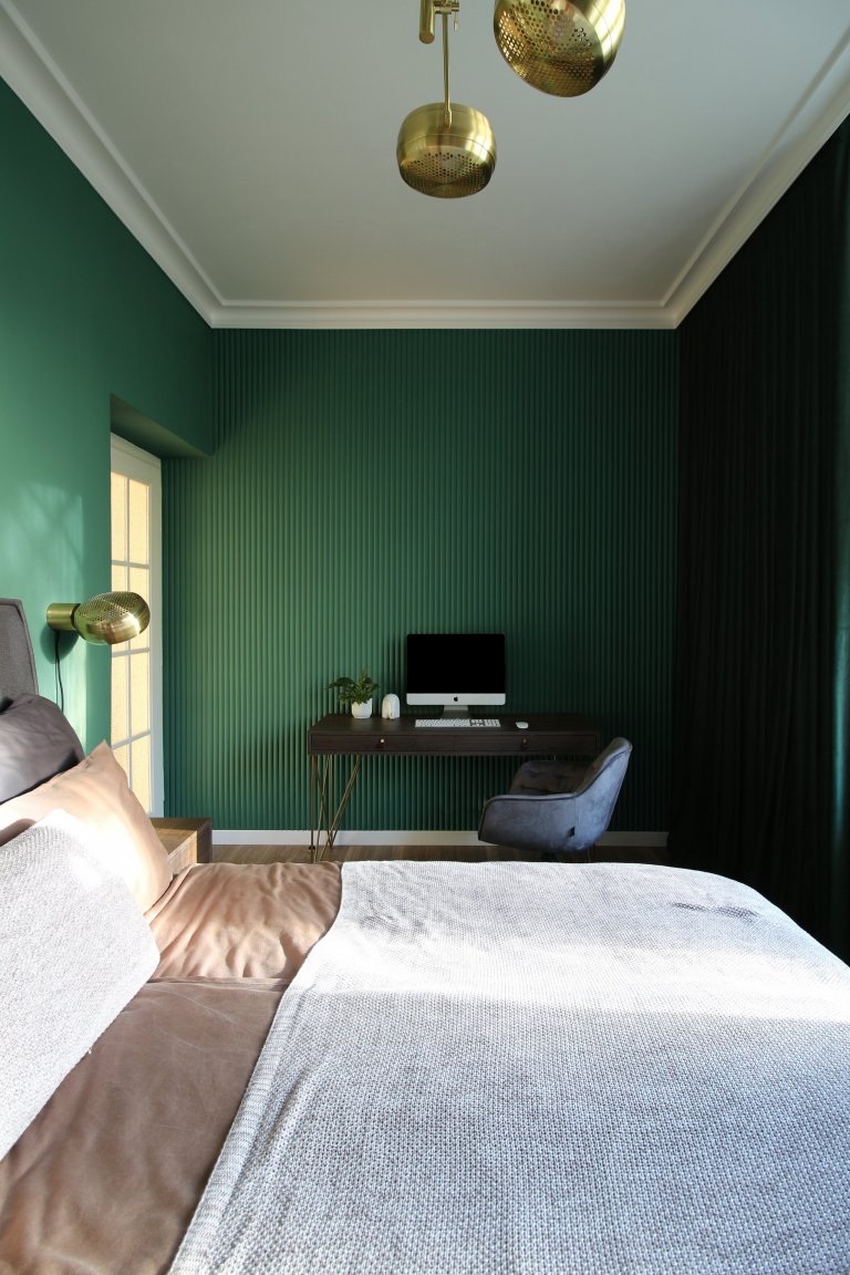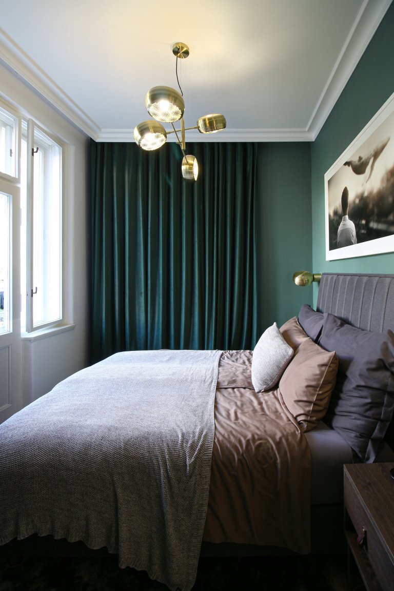 Ložnice je laděna do zelené barvy se zlatými detaily. Celé pokoj je monochromatický od zeleného koberce, stěn až po sametové závěsy. Zelenou barvu doplňuje šedá původní postel a šedá židle u pracovního stolu. Pracovní stůl byl spolu s nočními stolky vyroben na míru. Celá ložnice je doplněna obrazem od Martina Stranky.