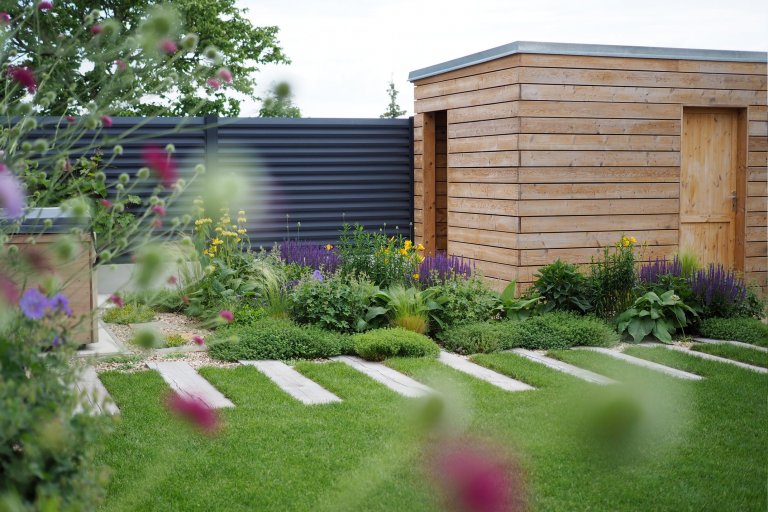 Na opačném konci zahrady je umístěný zahradní domek, který je s pergolou propojen dubovými nášlapy. Ty z volného trávníku částečně zacházejí do trvalkových záhonů, jejich mezery jsou řešeny výsadbou nízkých pokryvných trvalek, které ochotně snášejí sešlap. Součástí kompozice jsou i vyvýšené záhony, které paní domu využívá pro pěstování bylinek, dále trampolína pro nejmenší uživatele zahrady či vířivka jako náhrada bazénu, který velikost zahrady nedovolovala.