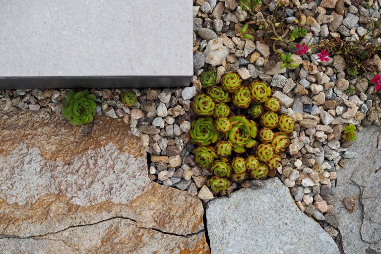 V přímé návaznosti na terasu vznikl bohatý trvalkový záhon, jehož květiny drze nakukují až k posezení a majitelé se tak mohou těšit nejen z jejich blízkosti, ale i vůně a rozmanitosti textur a struktur. Tento záhon je celoročně velmi atraktivním prvkem, pro zvýšení jeho exponovanosti byl vyzdvižen pomocí suché kamenné zídky, která jej jasně vymezuje od plochy trávníku a přibližuje jej terase. Zároveň jsme právě touto zídkou zakryli nevzhledný betonový okraj stávající terasy, který byl poměrně hodně výrazný.