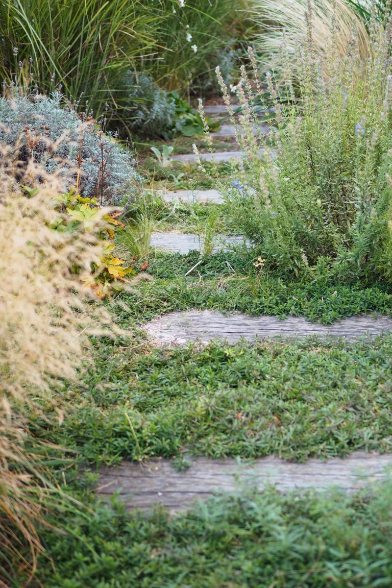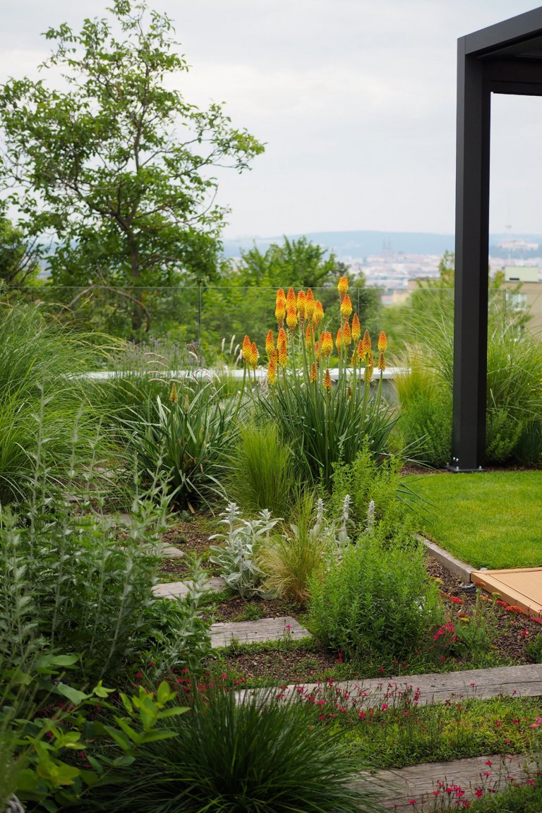 Mezi dalšími prosperujícími rostlinami můžeme jmenovat svatolíny, yzopy, krásnou červnovou solitéru mnohokvět (Kniphofia uvaria), levandule nebo devaterníky. Celkově převažují rostliny v módních chladných odstínech, ale díky použití žlutě a oranžově kvetoucích trvalek působí zahrada mnohem tepleji a útulněji. Péče o výsadby hlavně díky závlaze spočívá spíše v redukci někdy až příliš přesemeňujících se yzopů a kavylů. Výhodou je, že tento typ výsadeb snese vysokou míru spontaneity, takže jsme uvítali i některé nálety rostlin z okolí, např. lnice (Linaria vulgaris).