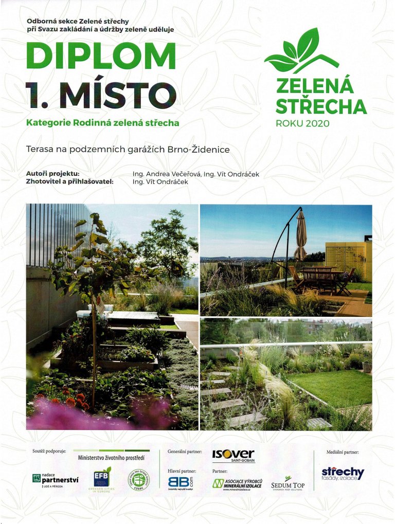 Řešený prostor vznikl na konstrukci podzemních garáží nové bytové výstavby v Brně, kde mladá rodina zakoupila byt ve spodním podlaží, díky čemuž má privilegium tento kousek plně využívat. Na nevelkou plochu zhruba 125 m² půdorysu tvaru L jsme se snažili vměstnat vše, co bývá jinak standardem až o několik kilometrů dál od centra v suburbánu (snad kromě bazénu). Nejprve jsme s plochou trávníku v návrhu nepočítali vůbec, ale nakonec jsme rádi, že si ho investoři prosadili. Ukázalo se, že s automatickou závlahou není problém trávník na cca 30 cm střešního substrátu udržet v odpovídající kvalitě.