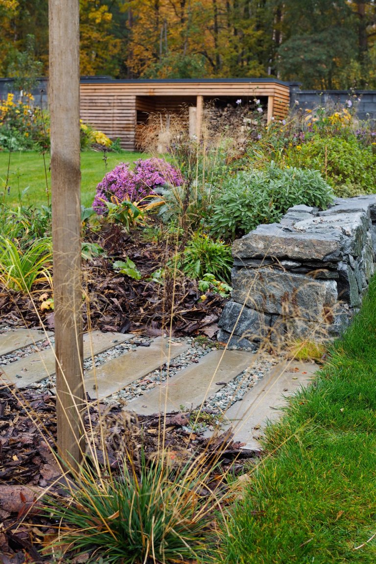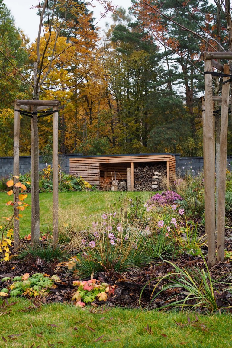 Zahrada se rozkládá na rovinatém terénu, její hlavní částí prochází suchá kamenná zídka, která jednak vymezuje hlavní pobytovou plochu trávníku, jednak funguje jako sedací prvek. Nad zídkou je navržen divoký trvalkový záhon, který se projektuje do oken domu a zpříjemňuje tak pohled do zahrady. Abychom v jinak plochém záhoně zdůraznili vertikálu, je jeho součástí skupina stromů, které nám zde vytváří jednodruhový hájek, zajišťující stín v letních měsících.